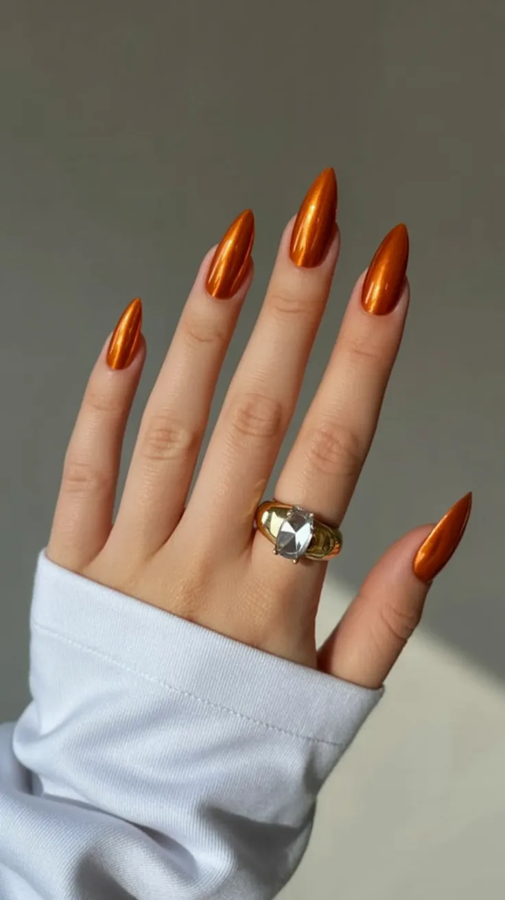 This is a great comparison point if you usually lean toward pink or nude. Orange feels fresher and more expressive, especially for spring chrome nails 2026. The almond shape balances the intensity, making it wearable while still turning heads. A strong choice for women who love confident color.