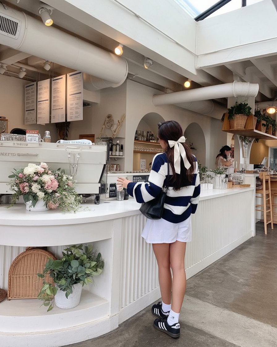This look blends sporty and feminine in a way that feels very now. The graphic tee adds attitude, while the mini skirt keeps it light and playful. It’s confident, relaxed, and perfect for city movement.