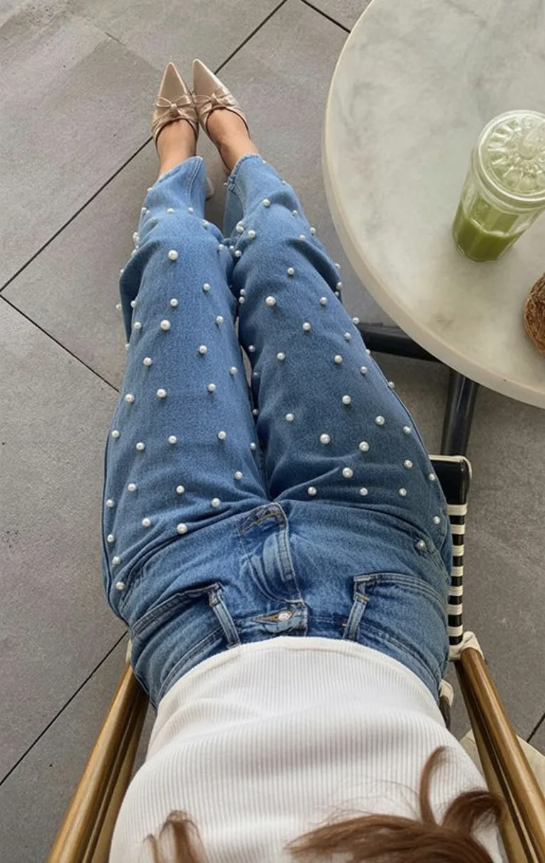 This outfit feels playful and relaxed, like a quiet coffee moment turned into style inspo. The pearl details add personality to classic denim, giving the look a soft twist that feels intentional without being overdone.