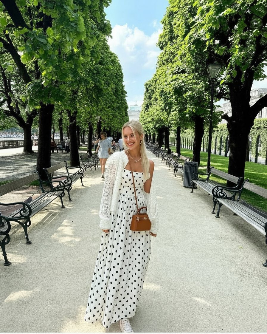 This outfit feels romantic and relaxed, perfect for a long walk through tree-lined paths. The polka-dot dress flows beautifully, creating movement that feels effortless and calm.