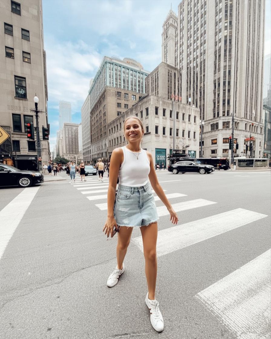 This outfit captures pure spring freedom—walking confidently through the city with a smile, no heavy layers in sight. The simplicity of a white tank and denim mini feels timeless, letting the energy of the city do the talking.