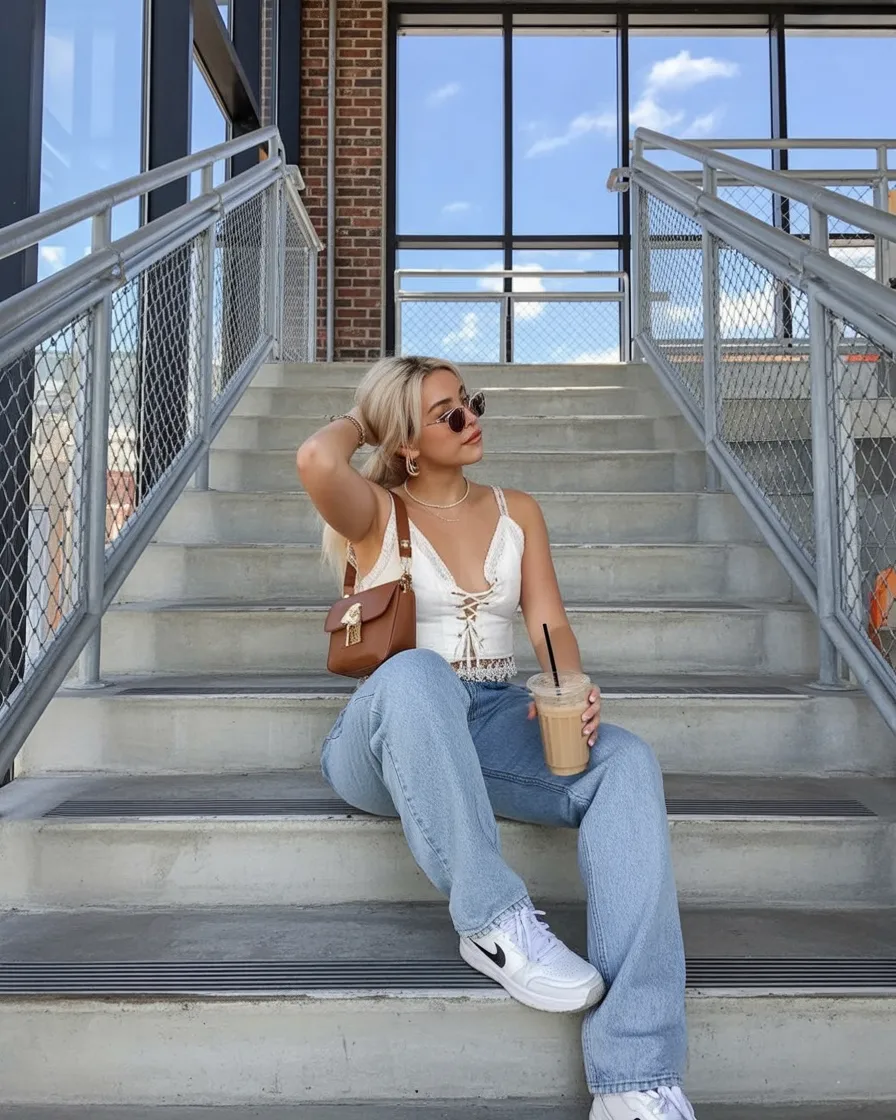 This outfit feels like a pause in a busy day—sitting on city steps with an iced coffee, soaking in the moment. The soft lace top adds a feminine touch, while loose jeans keep things grounded and real. It’s the kind of Inspo that feels lived-in, not styled for attention, which is exactly why it works so well.
