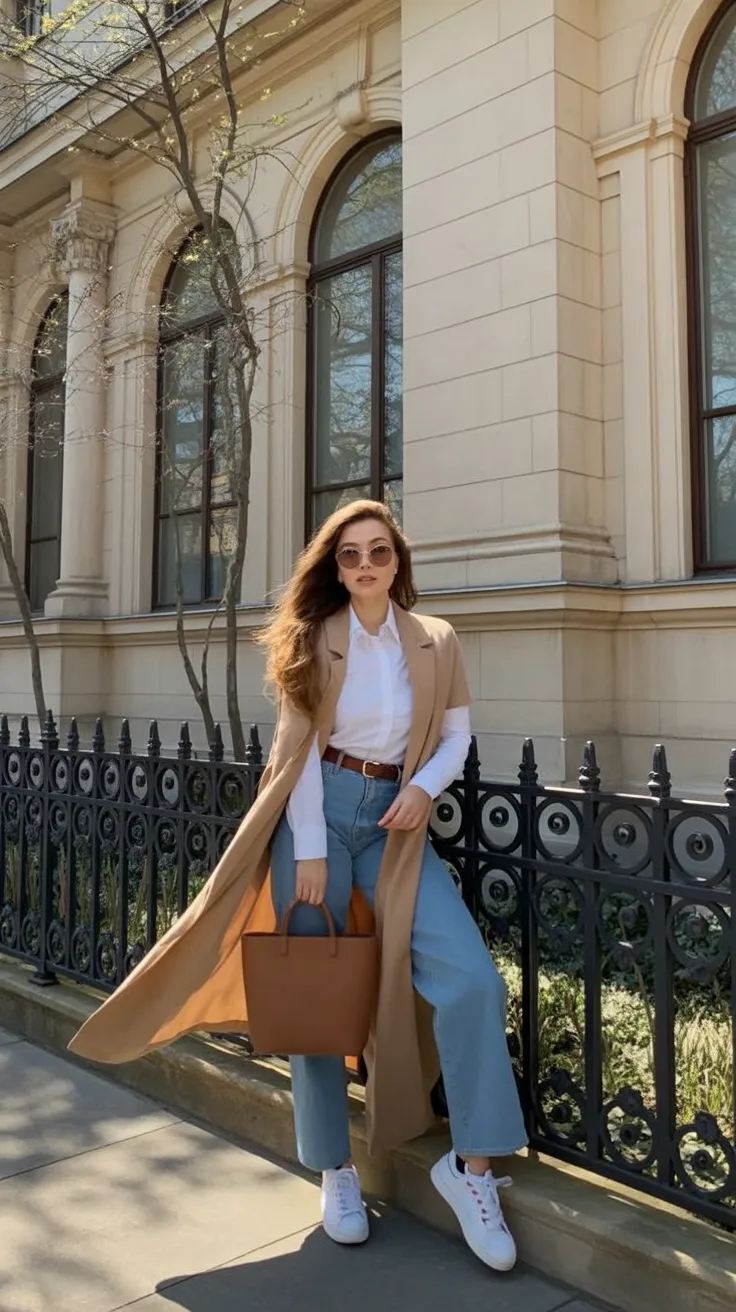 This look feels timeless and put-together, like a classic New York uniform with a modern update. The long coat adds movement and elegance, while jeans keep it grounded and wearable.