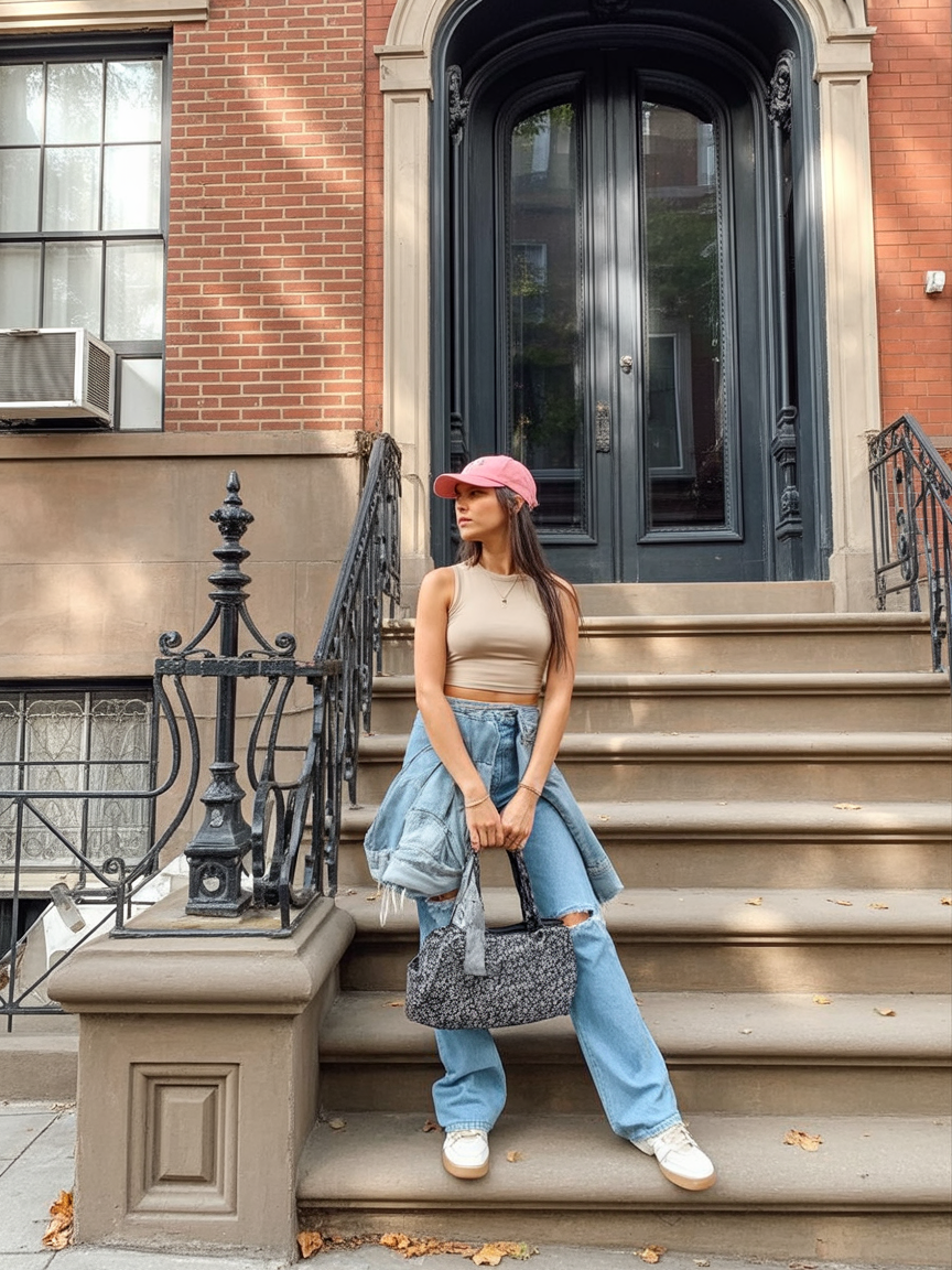 This outfit feels effortlessly cool—the kind of look that belongs on quiet brownstone steps. The cropped tank keeps it fresh, while baggy jeans add that relaxed New York attitude.