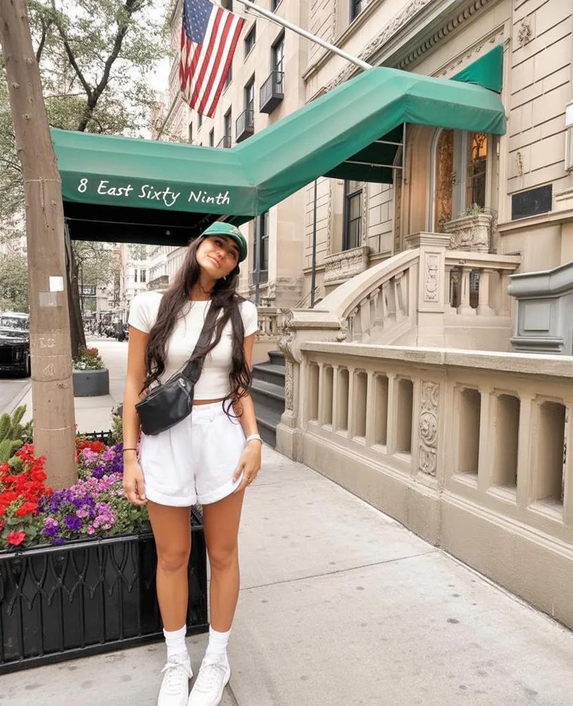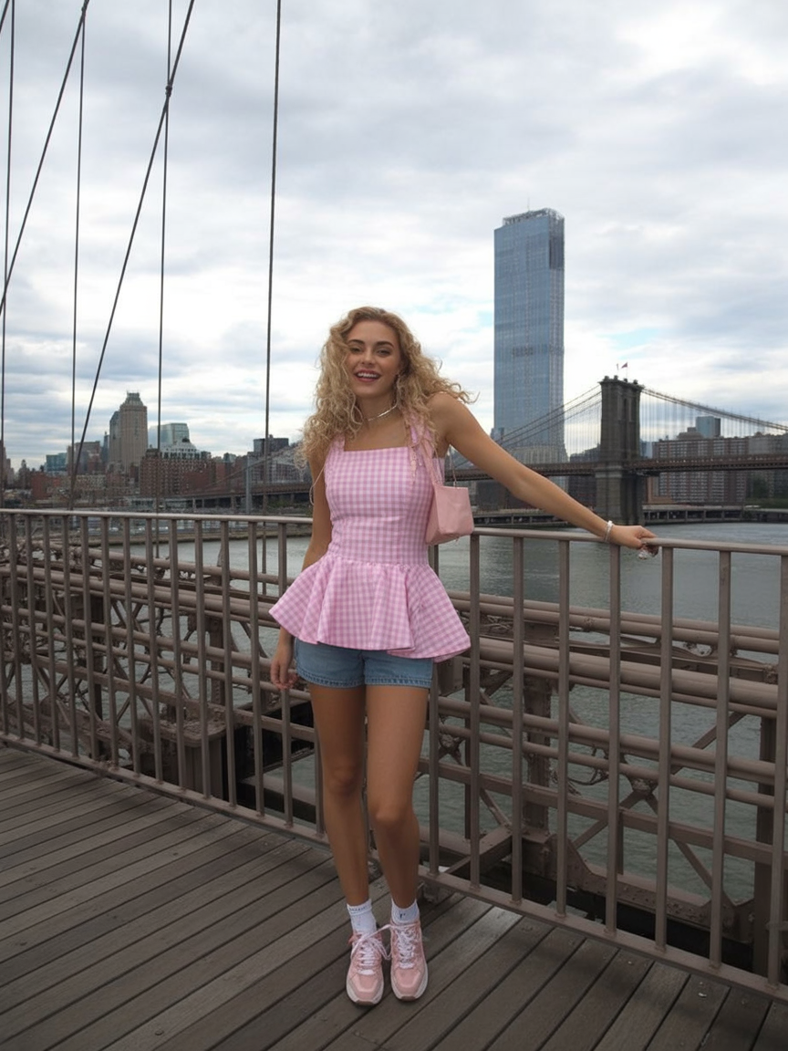 There’s an undeniable joy in this look—fresh, playful, and full of spring optimism. The pink gingham top feels youthful without being immature, especially against the iconic city skyline. It captures that lighthearted energy that starts creeping in around May, when you finally believe warmer days are here to stay.
