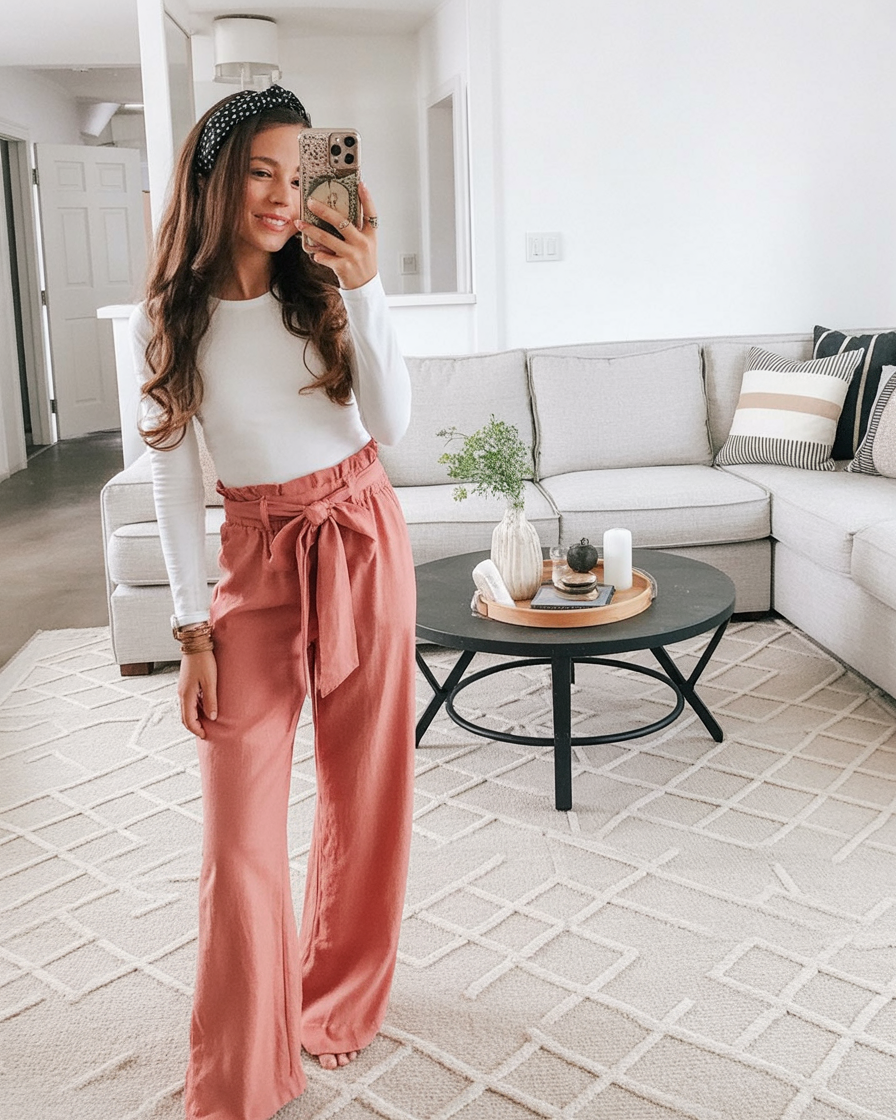There’s something quietly elegant about this outfit. A fitted long-sleeve top paired with soft paperbag waist pants feels refined yet relaxed, like you’ve found that perfect balance between comfort and intention. It’s calm, polished, and very grown-in in the best way.