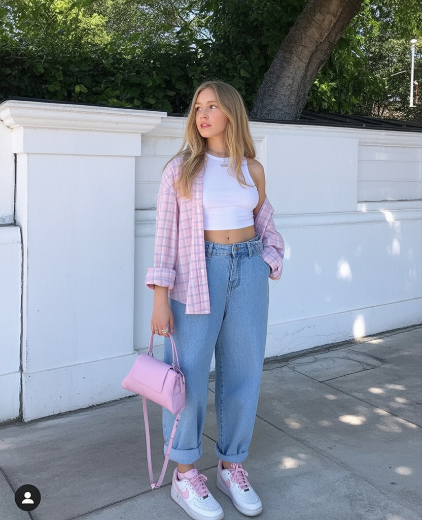 Soft colors always bring a sense of optimism, and this outfit leans fully into a pastel aesthetic that feels fresh for spring. The cropped top layered under an open shirt keeps things playful, while the relaxed jeans add balance and comfort. It’s youthful without trying too hard.