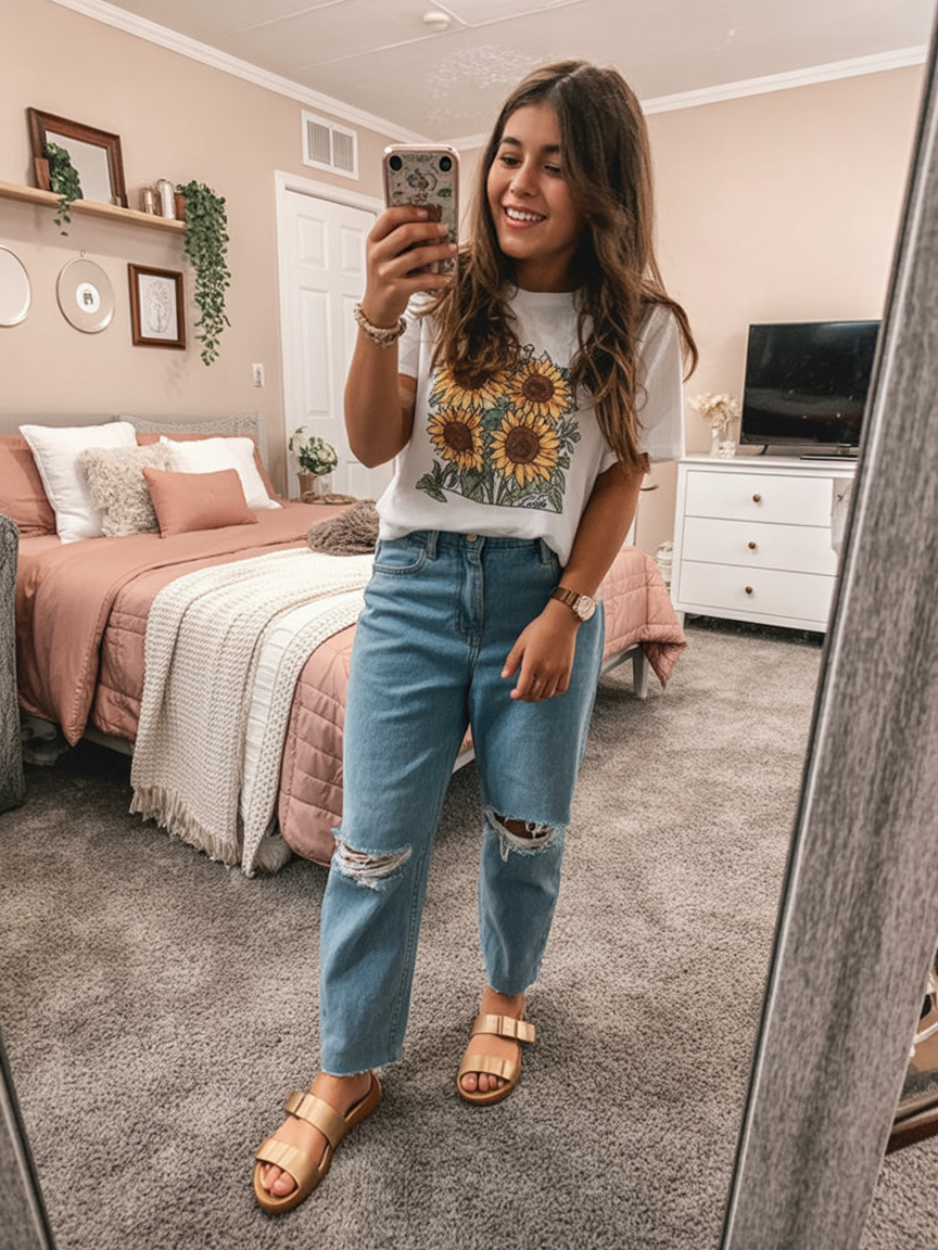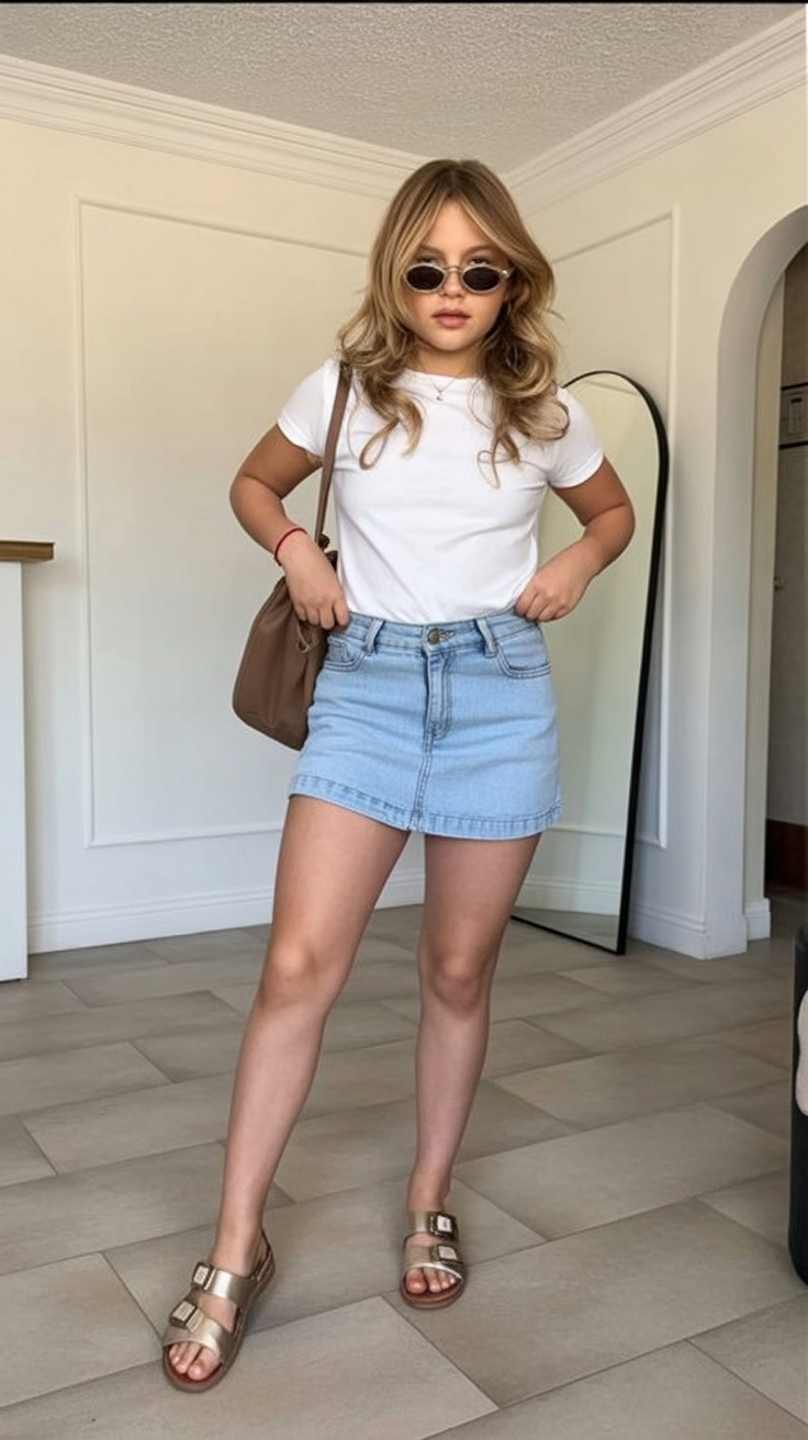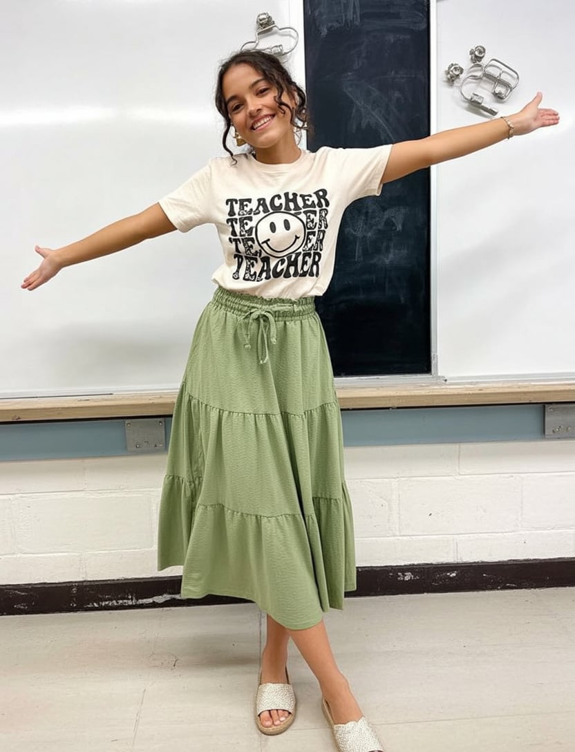 This outfit works especially well for middle school or high school settings where comfort matters just as much as confidence. The skirt offers ease of movement, while flat sandals or sneakers keep it grounded. It’s a great reminder that simple pieces can still feel special.