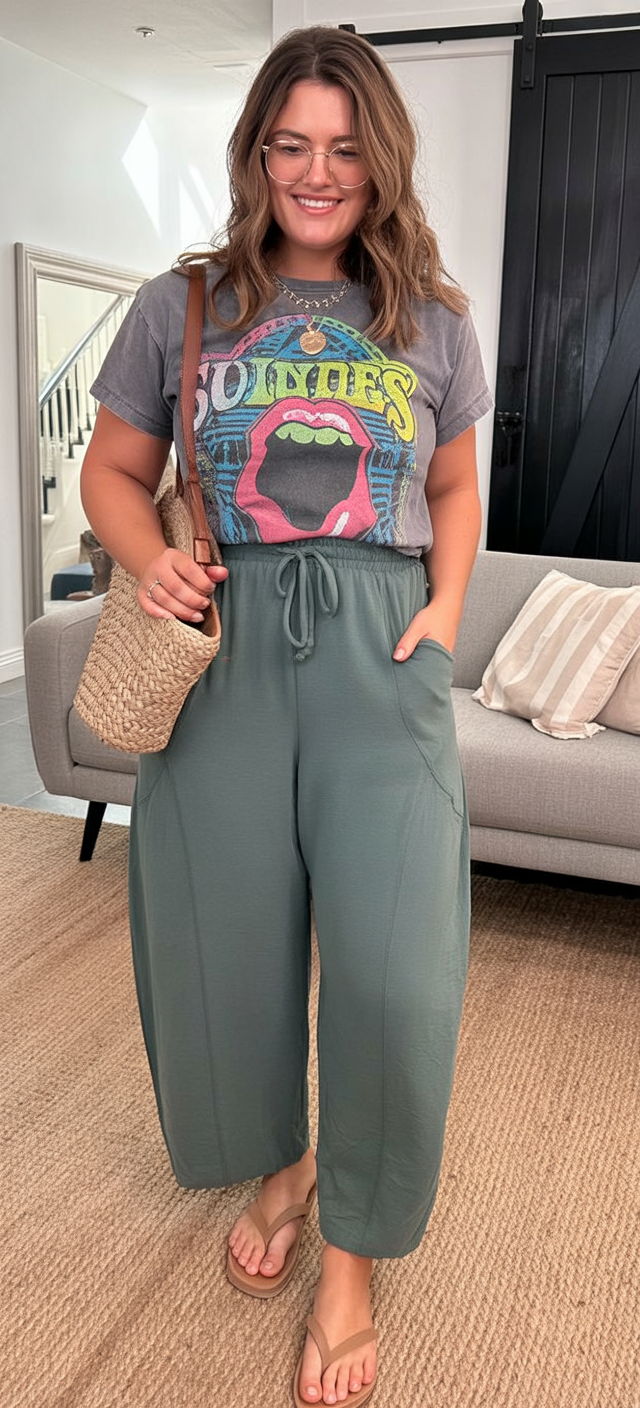 This outfit feels relaxed but intentional, like you’ve mastered the art of effortless dressing. A vintage-style graphic tee paired with soft, wide-leg pants creates a laid-back silhouette that still feels stylish and modern.