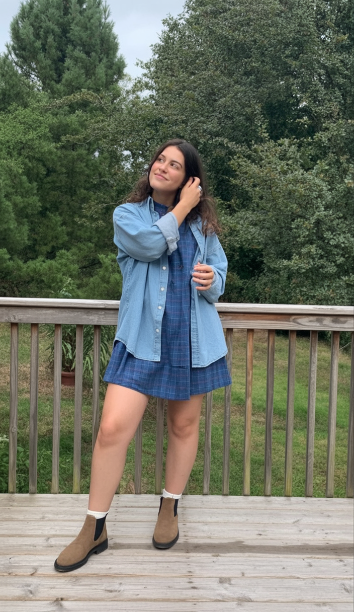 This outfit feels like a deep breath of fresh air. A simple dress layered with an oversized denim shirt creates a relaxed, outdoorsy vibe that feels grounded and real. It’s casual in the best sense—comfortable, confident, and unfussy.
