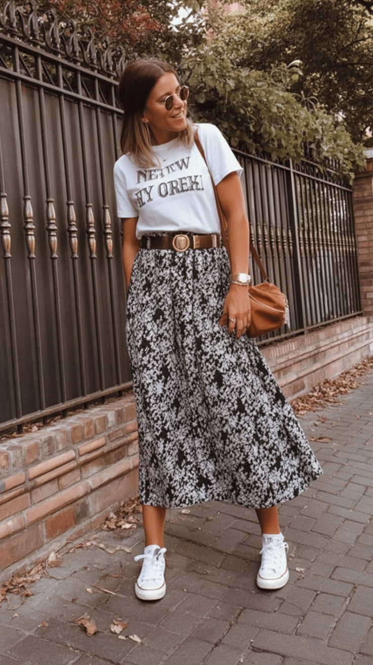 There’s an easy charm in mixing a casual graphic tee with a flowing printed skirt. It feels creative and confident, like you’re not afraid to blend comfort with personality. This is the kind of outfit that gets compliments without looking like you tried too hard.