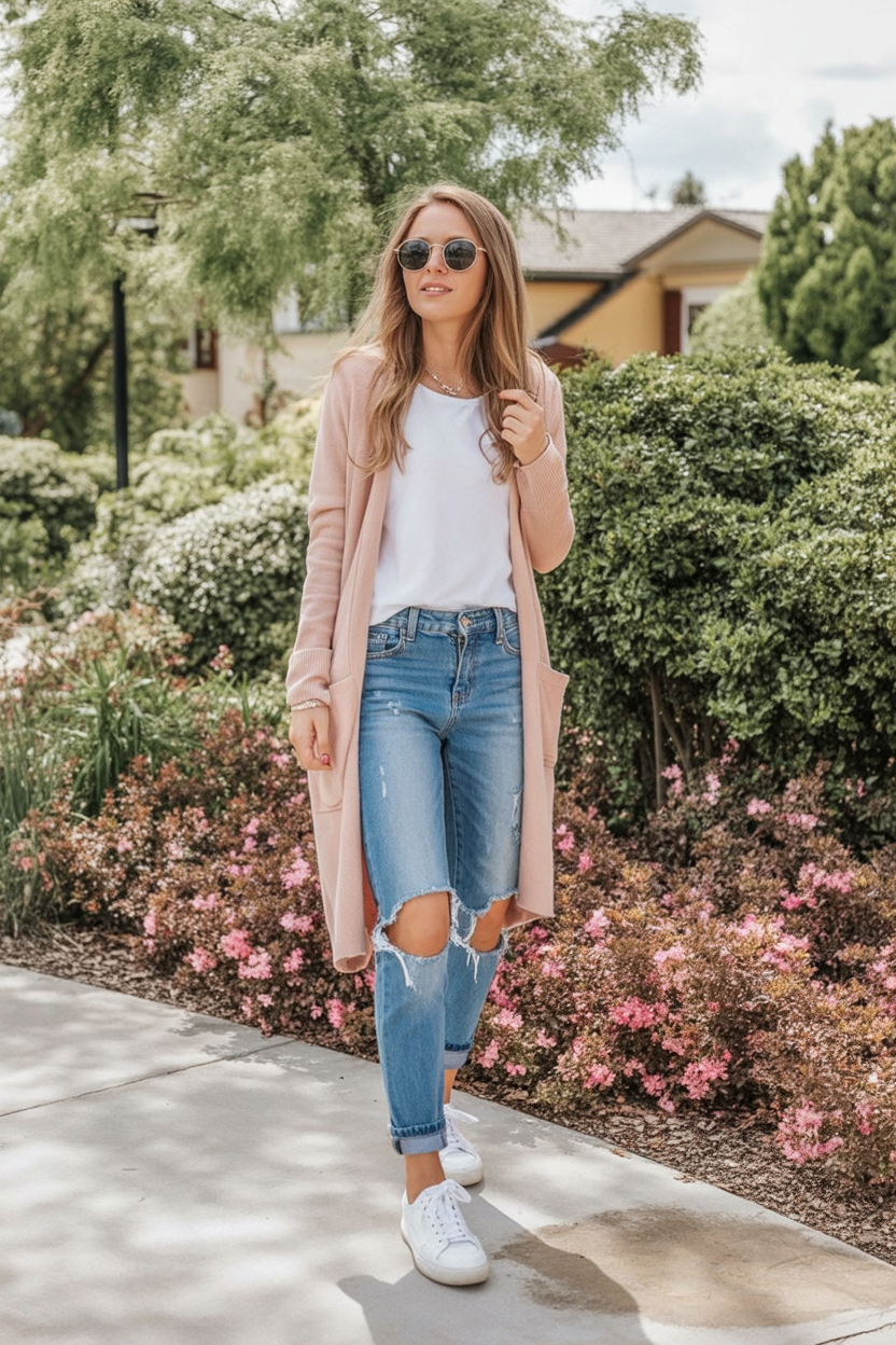 There’s something undeniably cozy about a light cardigan layered over a simple tee. Paired with distressed jeans, it feels approachable and warm—like the outfit version of a friendly smile. It’s perfect for spring days that start chilly and warm up fast.
