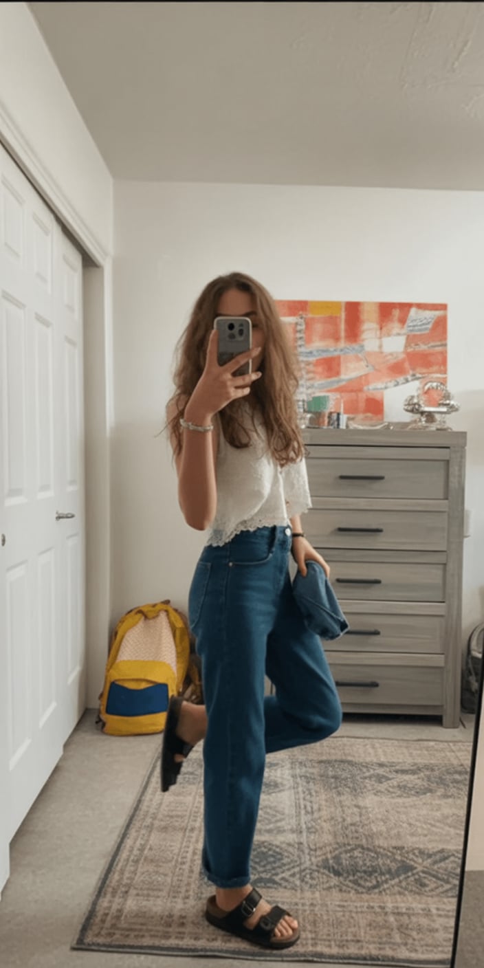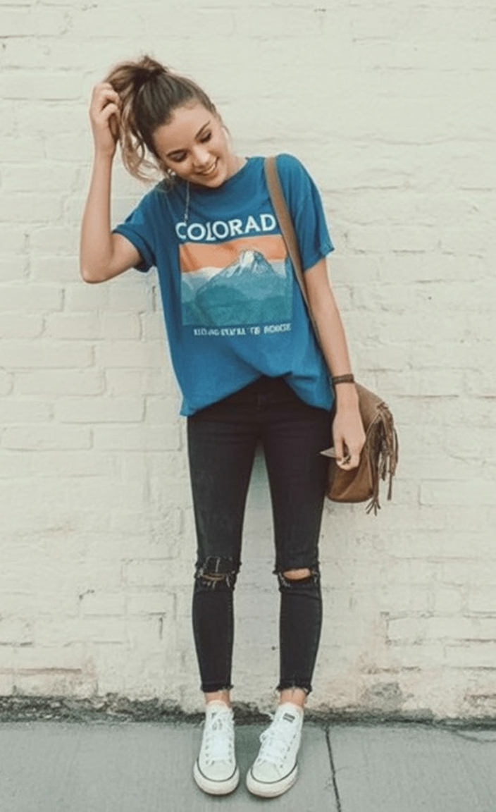 If you love casual fits that still feel expressive, this one’s for you. It works beautifully with a white sneaker and fits right into everyday school life, offering inspo for women who want style that feels natural and wearable.