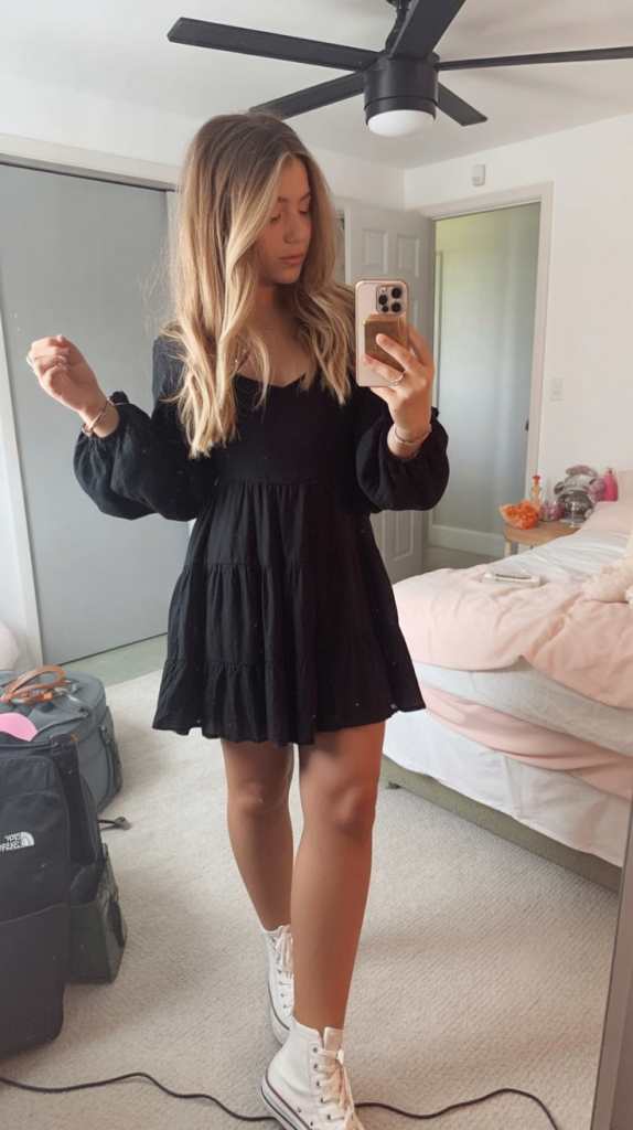 This outfit has that quiet confidence that doesn’t need explaining. A soft, flowy black dress feels timeless and a little romantic, yet pairing it with sneakers gives it a grounded, modern twist. It’s the kind of look that works whether you’re strolling across campus or grabbing coffee before class—casual, but never boring.