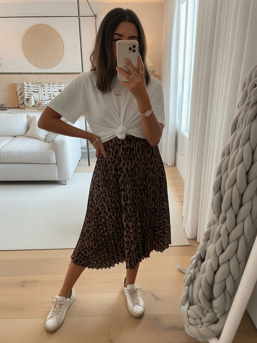 There’s a polished ease to this outfit that feels quietly stylish. A knotted white tee softens the look of a flowing midi skirt, creating a balance between relaxed and refined. It’s feminine without being fussy, and it feels like something you’d wear on a day when you want to feel a little extra confident.