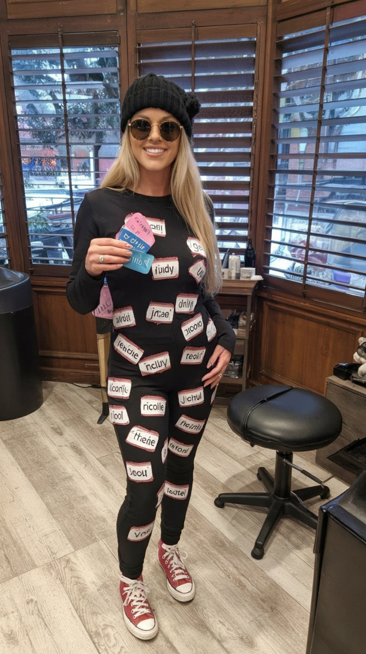 Sometimes the best costumes are the simplest — and the punniest! This clever getup covered in “Hello my name is” tags is the ultimate low-effort laugh. The mystery names are a conversation starter all night long.