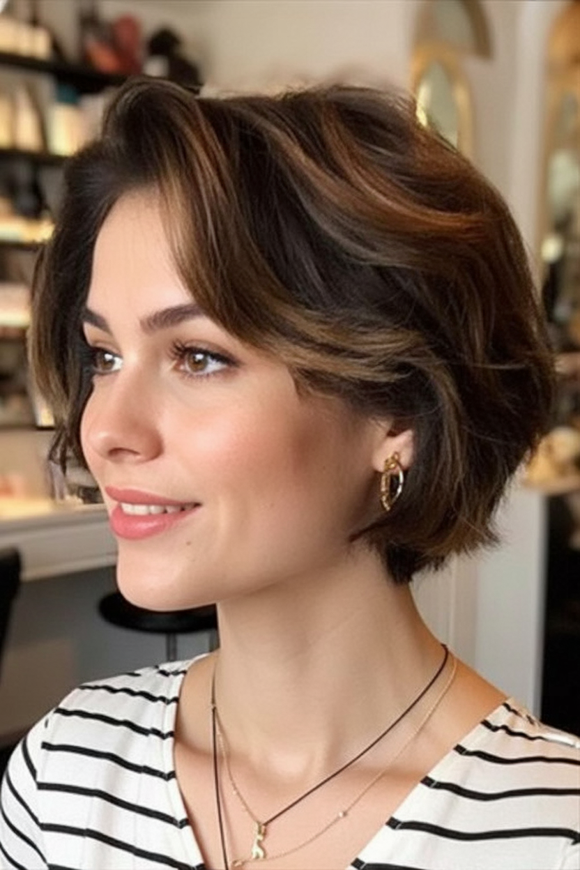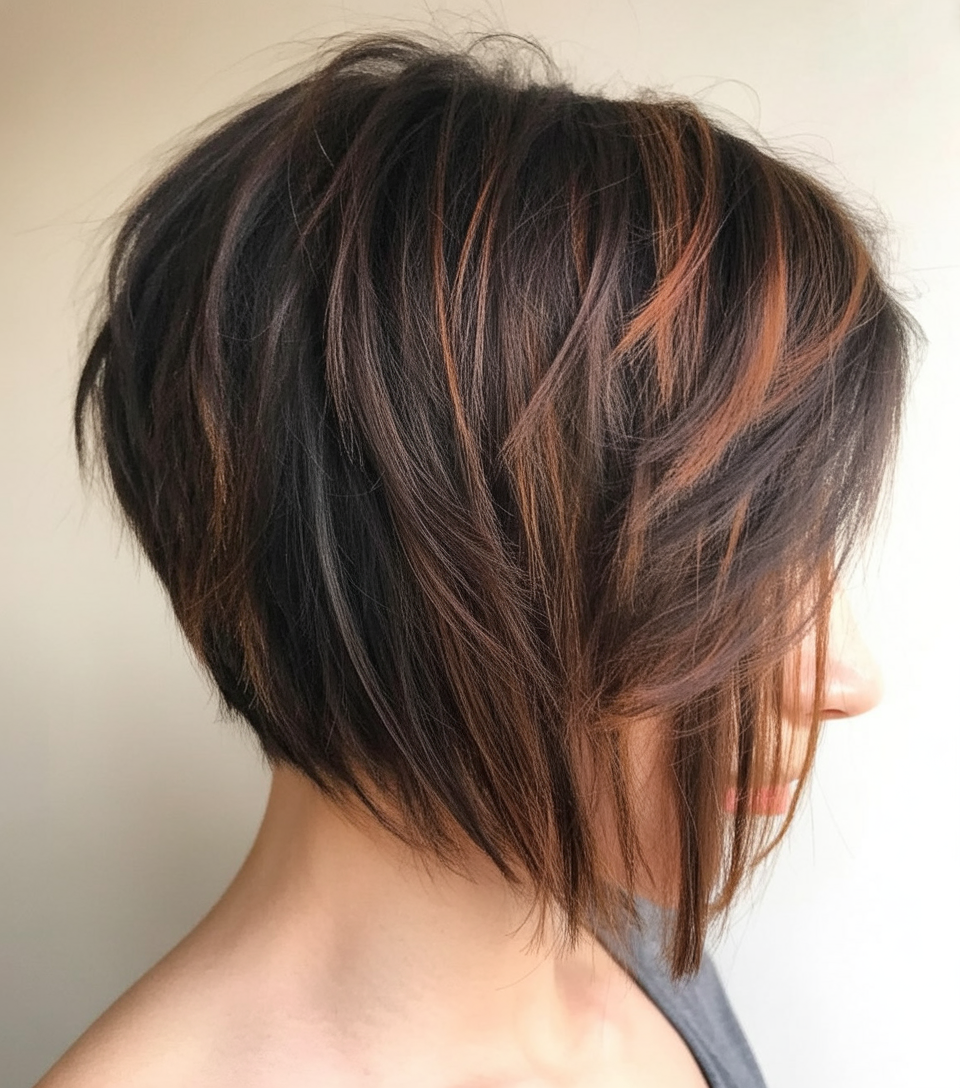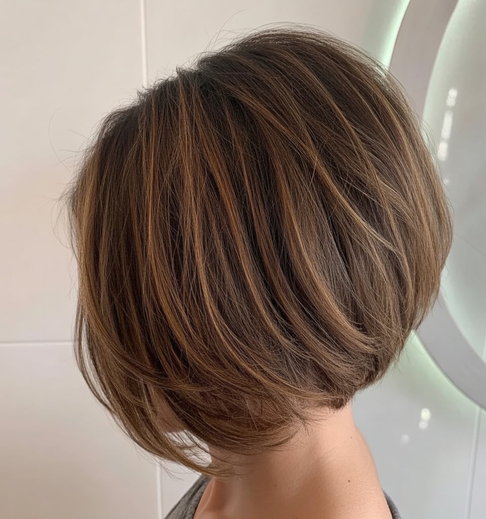 Chic and structured, this short stacked bob delivers instant sophistication. The angled back creates lift while the longer front pieces keep it flattering and feminine. It’s bold but not severe — the perfect mix of sharp and soft.
