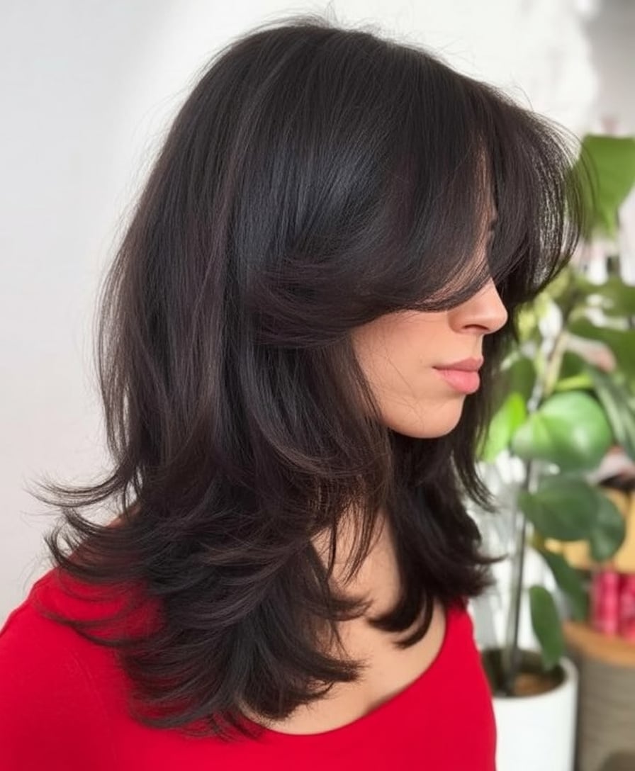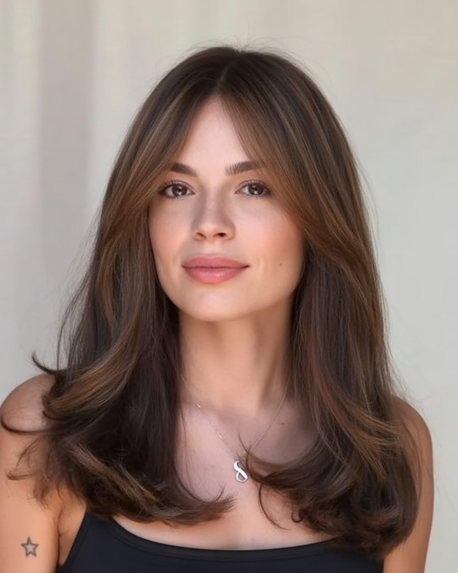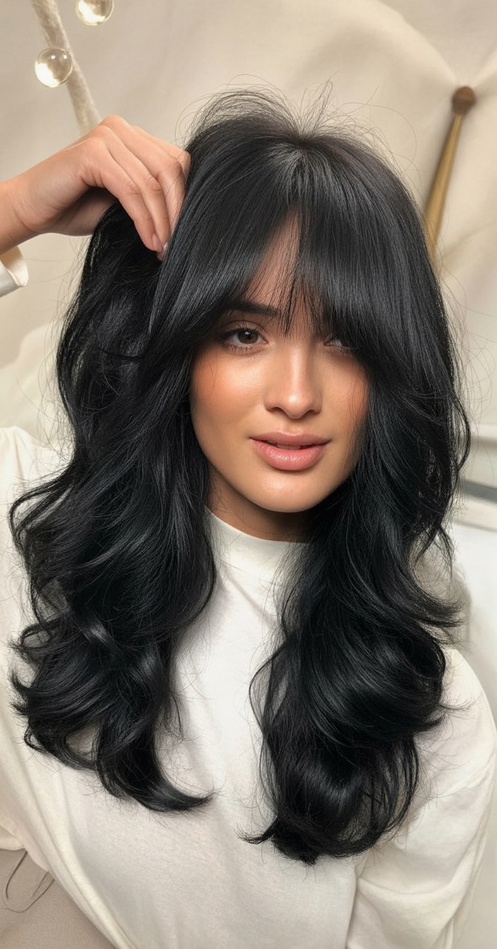 Long layered haircut with bangs instantly exudes sophistication with just a hint of playfulness. The full bang sweeps across the eyes, while the cascading lengths provide volume that is at once modern yet timeless. It is a cut for women who want to be glamorous but without being unreachable.