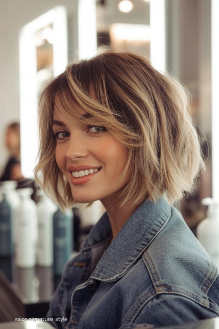 A tousled bob with bangs is the ultimate confidence-boosting cut — playful, modern, and full of personality. The short layers create a lively texture while the fringe adds softness around the eyes. It’s one of those rare styles that looks equally good styled or slightly messy.