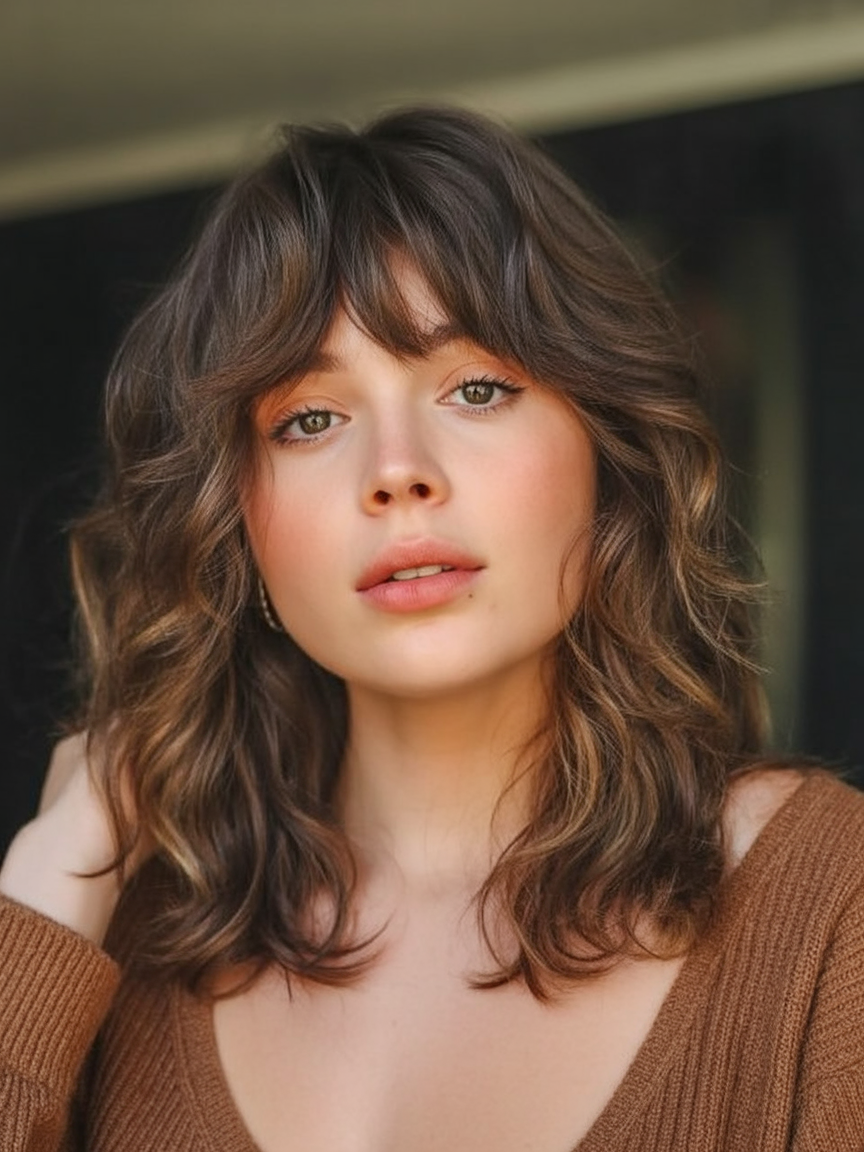 The shaggy medium cut with bangs exudes youthfulness and a carefree spirit. The choppy texture adds playful energy while face-framing fringes give softness and charm. This is the kind of haircut that feels like an instant lift, like you just reinvented yourself without losing that natural vibe.