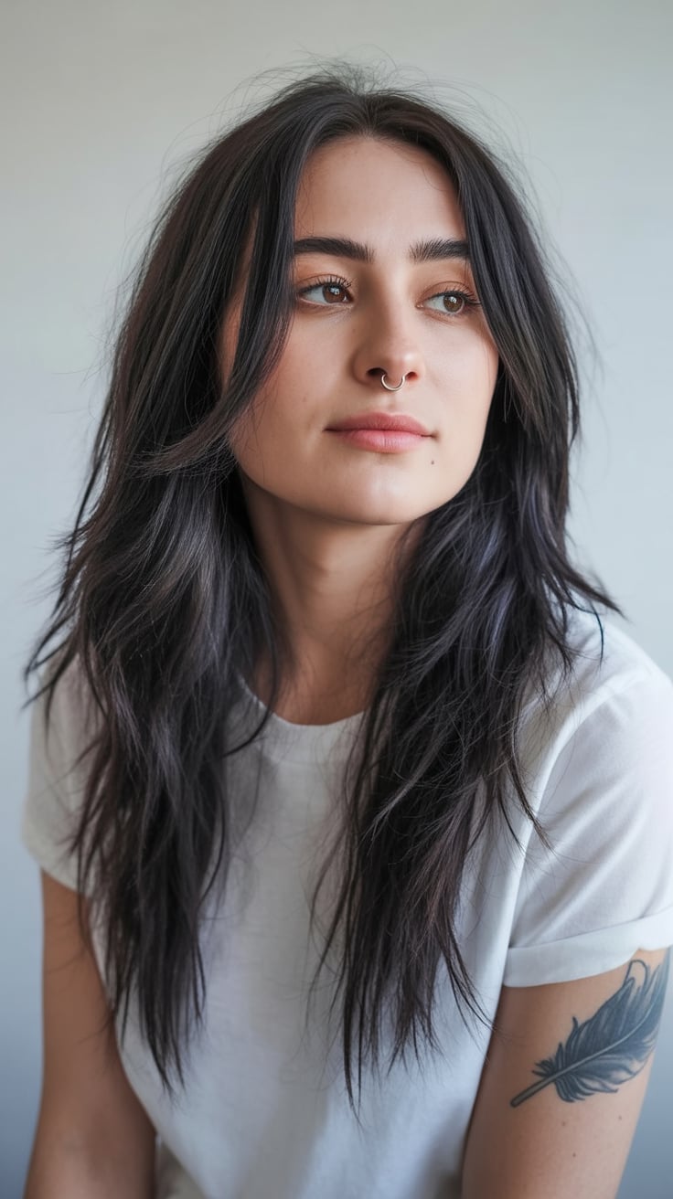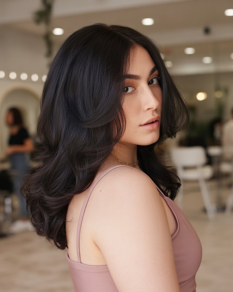 These long textured layers flow like silk, with subtle highlights enhancing every curve of the cut. It has that undone luxury “model-off-duty” vibe — elegant but never stiff. The length keeps it dramatic while the layering brings airiness through the ends.
