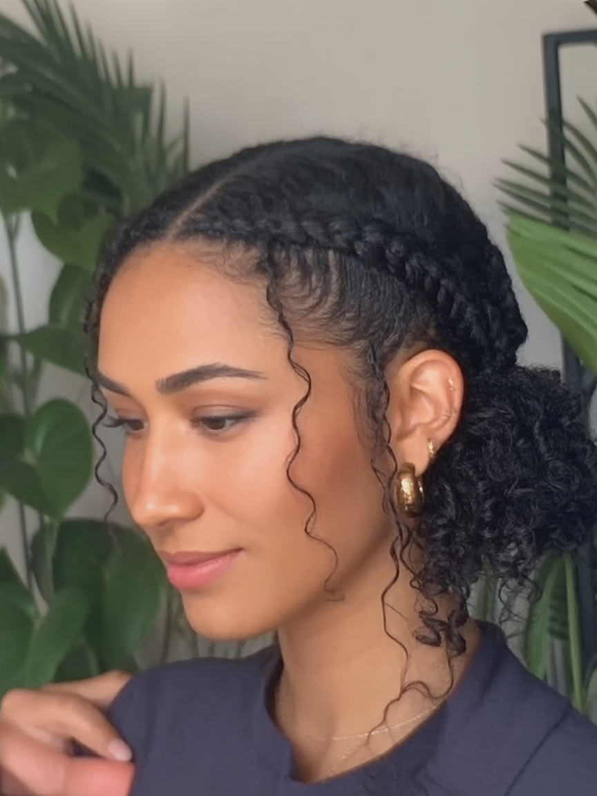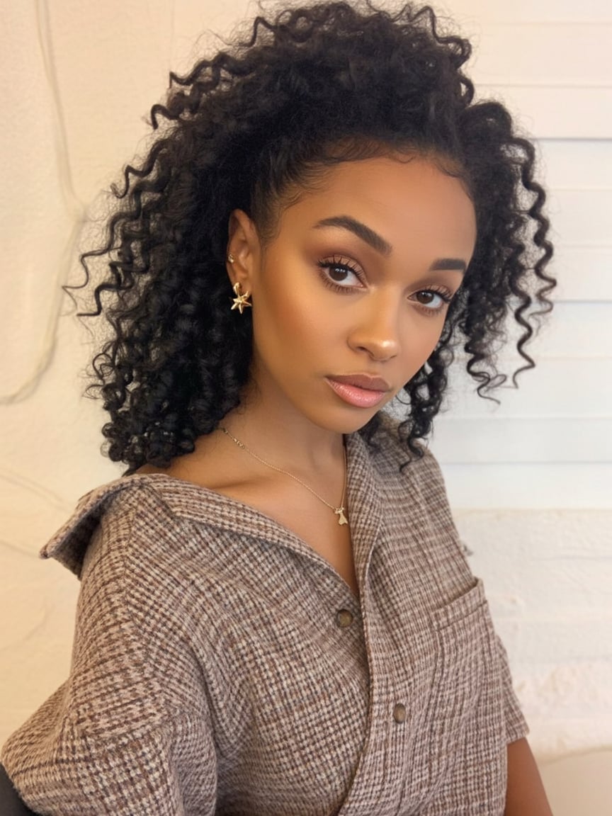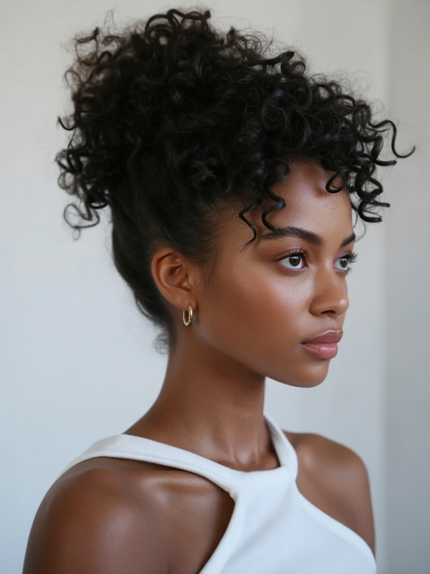 There’s something irresistible about a high puff that sits like a crown—springy, joyful, and full of personality. Those two corkscrew tendrils in front are the mic drop: they soften the hairline, highlight the eyes, and make the whole style feel fashion-forward yet playful. It’s a modern nod to ballet buns and ponytails, but with all the texture and movement that makes curly styles so fun. She’ll feel dressed up even in a tee and picture-ready the second she ties her shoes.