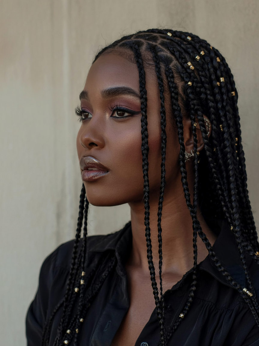 Sleek, waist-skimming box braids get a glow-up with tiny gold accents sprinkled throughout. The shine catches the light with every step, turning a classic protective style into something festive and confident. It’s versatile enough for a school week and special enough for ceremonies, giving her that just-right balance of neat lines and sparkle.