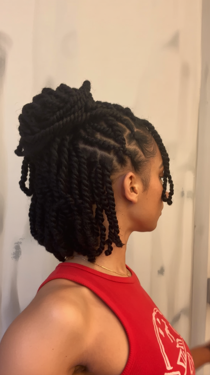 Current trends (2025): medium-size twists with softly tucked ends are a favorite for kids because they last, photograph well, and can be restyled into ponytails or buns in minutes. Ask for lightweight hair so the look stays breathable. Moisturize with leave-in, seal with oil, and sleep in a bonnet. Natural, easy, and perfect for school routines.
