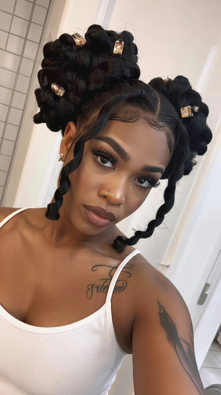 Sculpted jumbo Bantu knots styled as two high space buns deliver drama with a wink—bold shapes, defined parts, and twirled tendrils that frame the face. It’s artsy and adorable all at once, the kind of look that makes photos pop and mornings fun. She’ll feel like her own stylist with a style that’s both cultural and wildly creative.