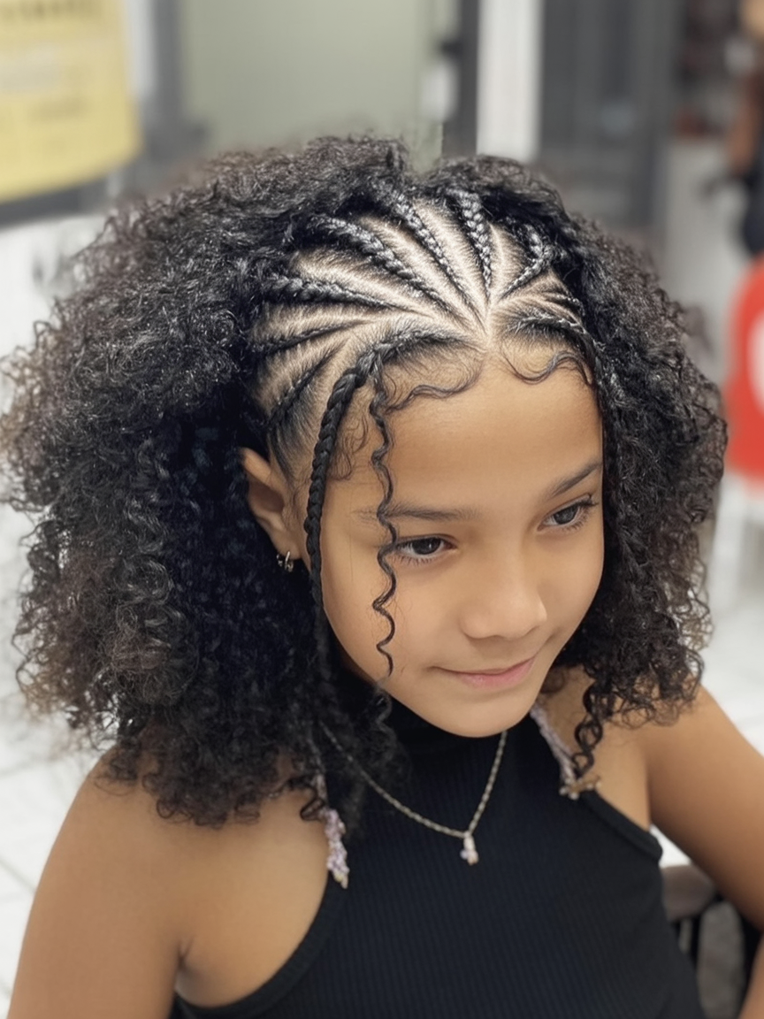A side-swept cornrow pattern curves like a sunburst around a fluffy cloud of curls. This is one, fun and carefree. It keeps the face open and lets the style wear and flaunt natural curls. The asymmetry is fun and fresh, and that one spiral in front is that eye candy. This style can have all the praise, all from the classroom and on to the playground.