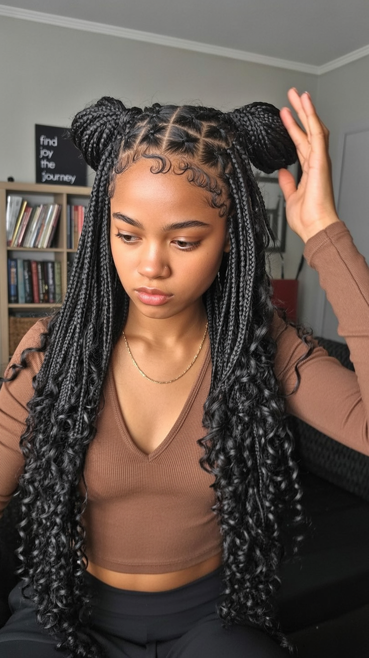 Two playful buns perched up top bring instant sparkle, while long braids finished with ringlets make the style feel whimsical and cool. It’s equal parts cute and confident—she can switch from homework to hangouts without touching a thing. The braids keep everything tidy, the curls add swing, and the face-framing edges softening the look feel like jewelry. This is the kind of braids kids style that turns every day into a good hair day.