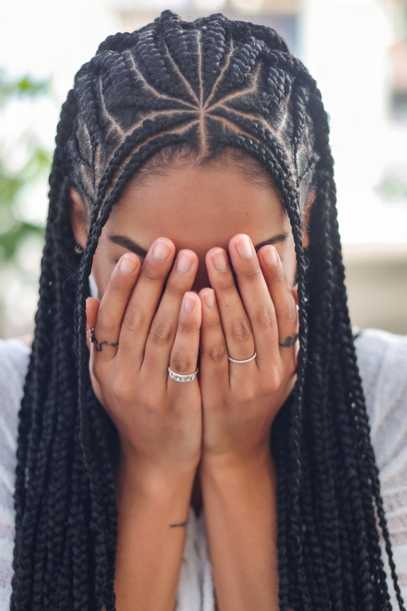 Graphic, creative parting turns classic knotless braids into a work of art. The starburst pattern radiates from the crown, giving structure without losing softness, while sleek lengths keep the vibe calm and confident. It’s a protective look that still feels expressive—ideal for school events, weekend practices, and everything in between. Expect compliments; this style has presence.