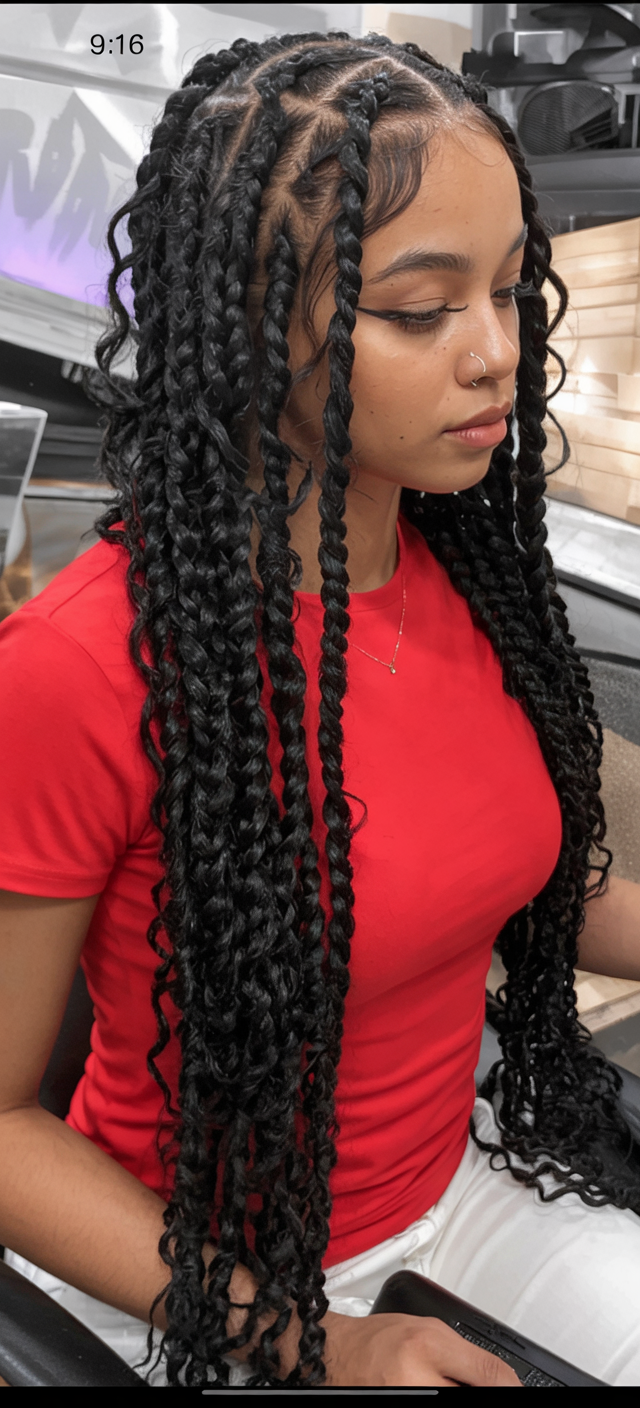 These boho box braids bring instant star energy—neat at the roots, carefree through the lengths, and finished with halo-like ringlets that move every time she does. It’s the kind of style that lets a girl be a girl: playful, confident, and ready for anything from weekend outings to school pictures. The mix of sleek braids and curly pieces gives dimension without trying too hard, so the look reads polished and still absolutely natural. Think of it as the sweet spot between statement and simplicity—perfect when she wants something pretty that lasts.