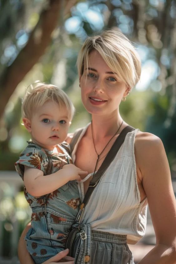 The sleek pixie cut is a bold statement for moms with short hair. This hairstyle is all about minimalism and ease, offering a sharp and edgy look that takes seconds to style. It’s particularly suited for moms who appreciate a no-fuss, chic style that keeps hair out of the way while they tackle the day.