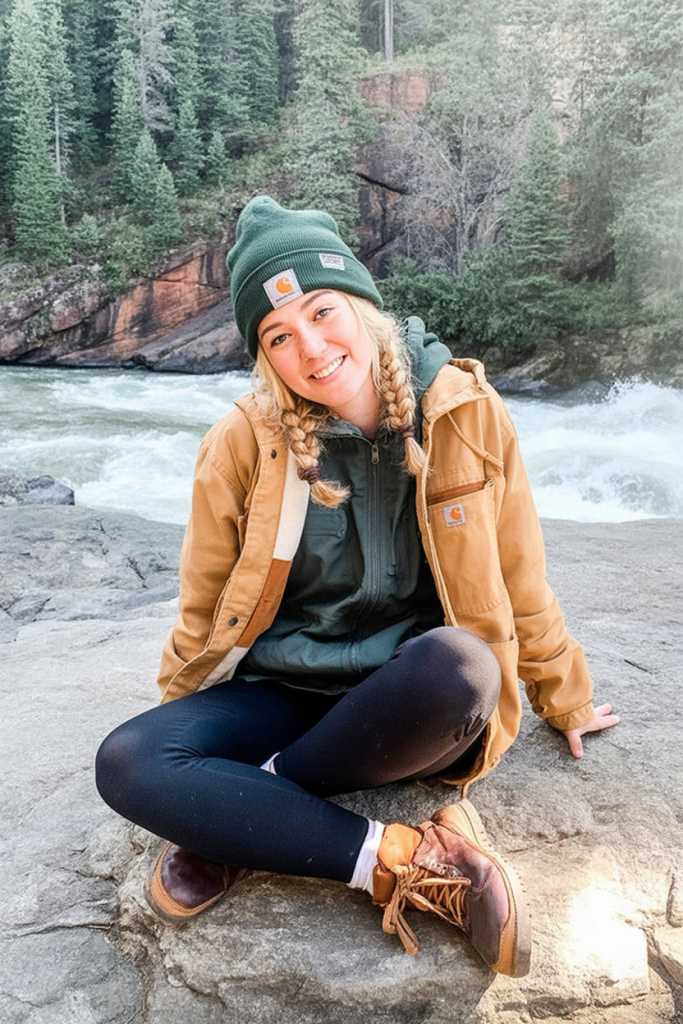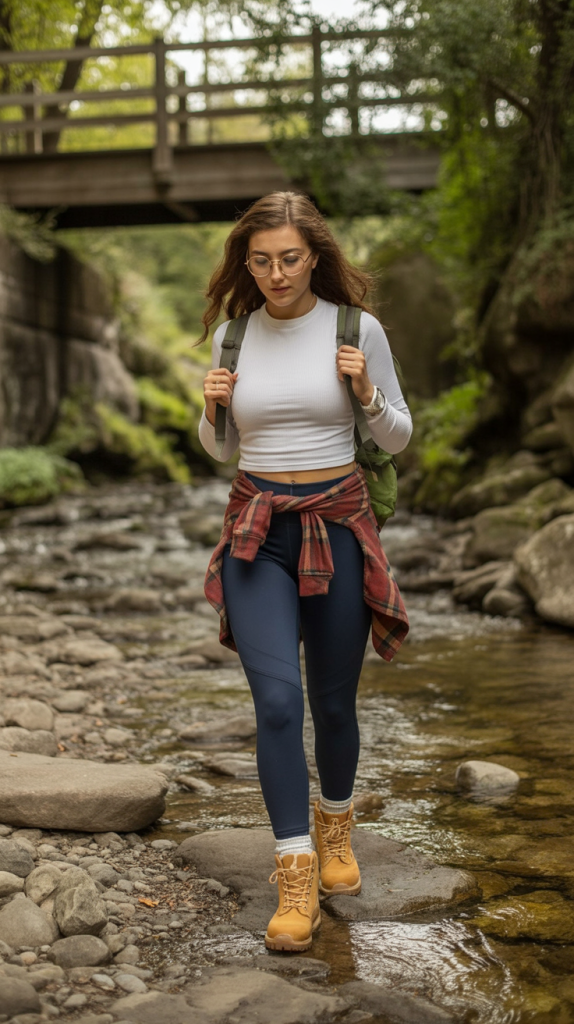 Choose this style if you want a low-maintenance look that’s still sharp. The leggings allow full movement, the boots handle everything from shallow streams to rocky paths, and the flannel layer helps you transition from cool morning air to warm afternoons. It differs from fussier outfits by giving you everything you need without weighing you down—perfect inspo for cold weather mornings that turn into bright summer afternoons.