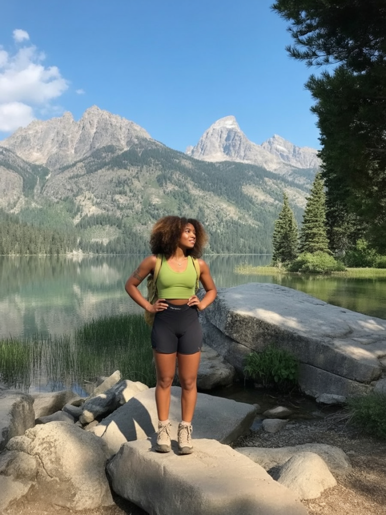 There’s something magnetic about a bold, sculpted silhouette against a quiet lake backdrop. This outfit radiates strength and joy, especially with the rich pop of green that feels perfect for women’s summer adventures. It’s an aesthetic that’s energetic and uplifting, as if the whole scene is cheering you on to go a little farther, breathe a little deeper, and enjoy the moment.