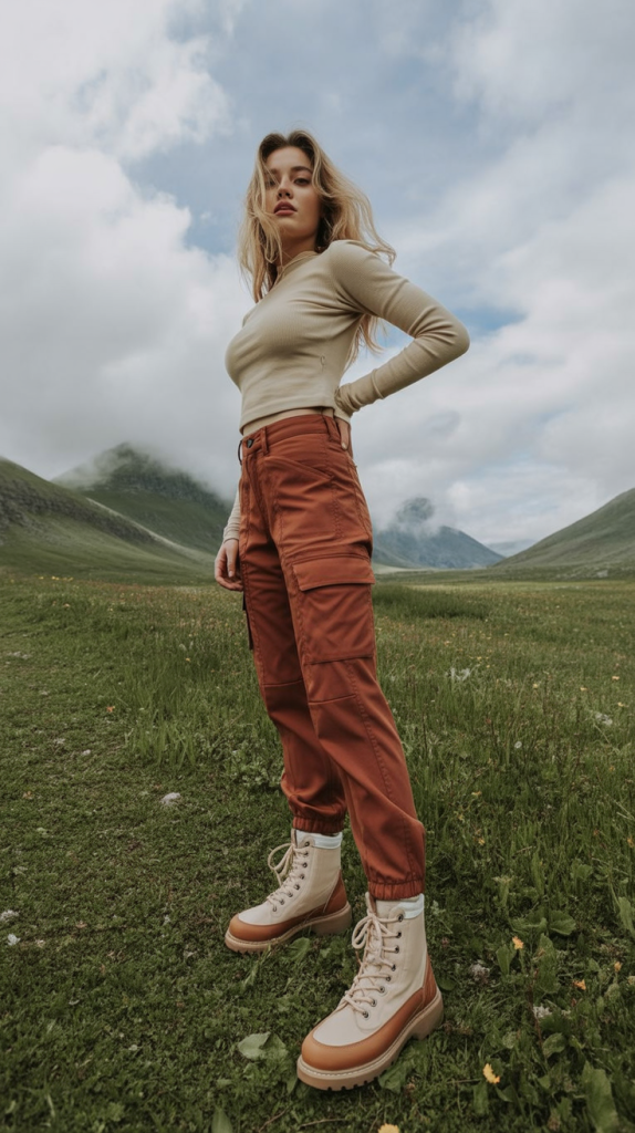This combo is perfect for women who prefer a bit more structure in their hiking wardrobe. The cargo pants provide durability and warmth in cold weather or windy conditions, while the boots add stability on uneven ground. Trend-wise, this look captures 2026’s love for elevated outdoor simplicity—clean, functional, but still unmistakably stylish.