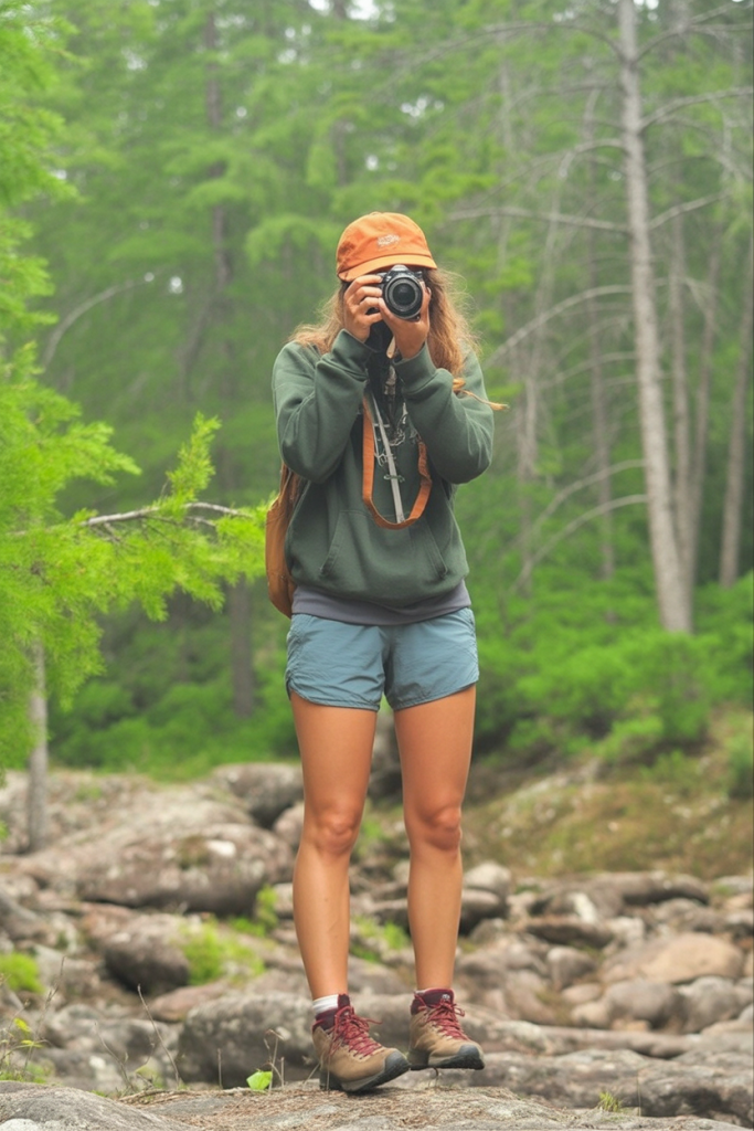There’s something wonderfully peaceful about this look—like a woman fully in her element, capturing the stillness of the forest while soaking in that crisp summer air. The layered green tones blend naturally with the woods, giving the whole outfit a relaxed, adventurous aesthetic that feels both cute and quietly confident. It’s the kind of vibe that makes you want to slow your pace and notice every detail around you.