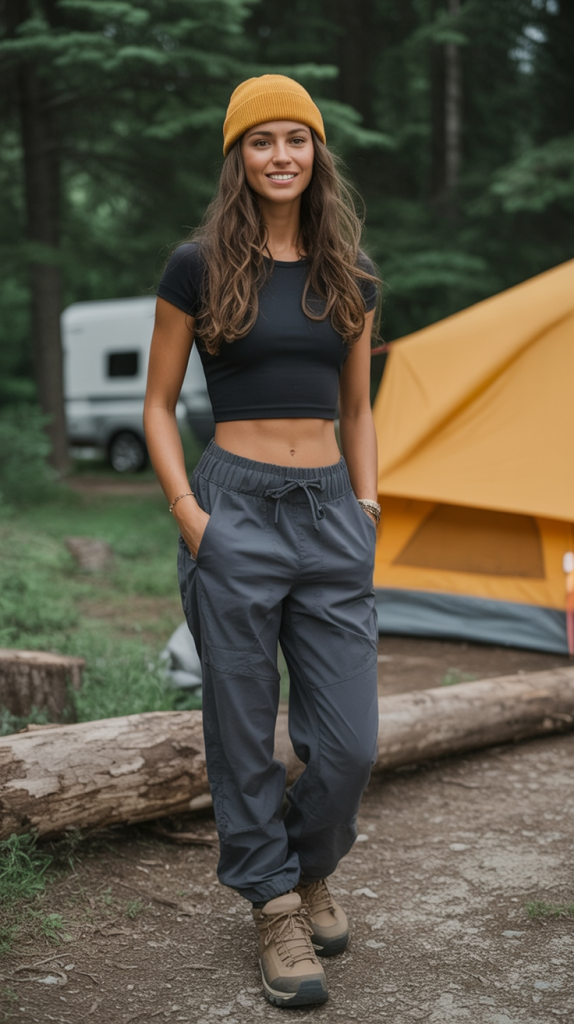 This outfit radiates easygoing charm—the kind that fits perfectly at a campsite, between tall pines and a cozy tent. The cropped top mixed with relaxed pants feels casual and cute, while the beanie adds a pop of color that instantly shifts the look into cool-girl territory. It’s simple but surprisingly stylish, especially for women who love relaxed outdoor vibes.
