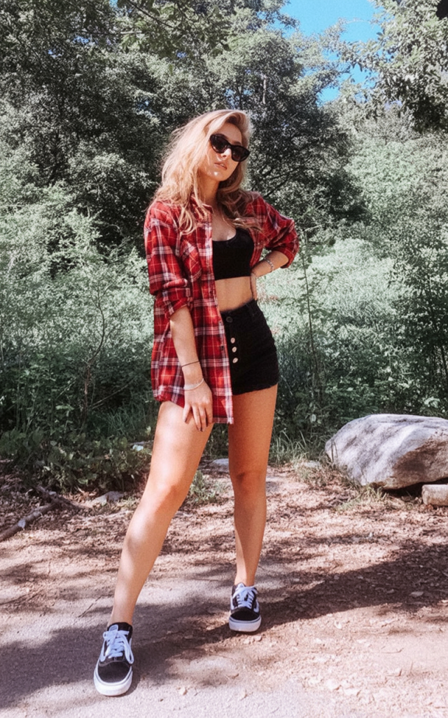This outfit has a fun, fiery energy—the kind you get when you step out feeling bold and ready for whatever the day gives you. The red flannel adds that classic outdoorsy edge, while the sleek black pieces keep everything modern and stylish. It’s playful, cute, and full of women’s summer inspo.
