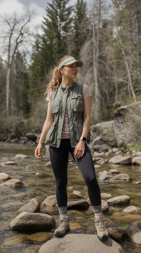 The beauty of this outfit lies in the gear layering. The vest’s pockets make it ideal for women who love to wander hands-free, while the leggings offer flexibility for long walks or light scrambles. If you’re looking for a standout piece, the vest is your star—it brings attitude and function, making it a great choice for colder summer mornings or light winter mountain strolls.