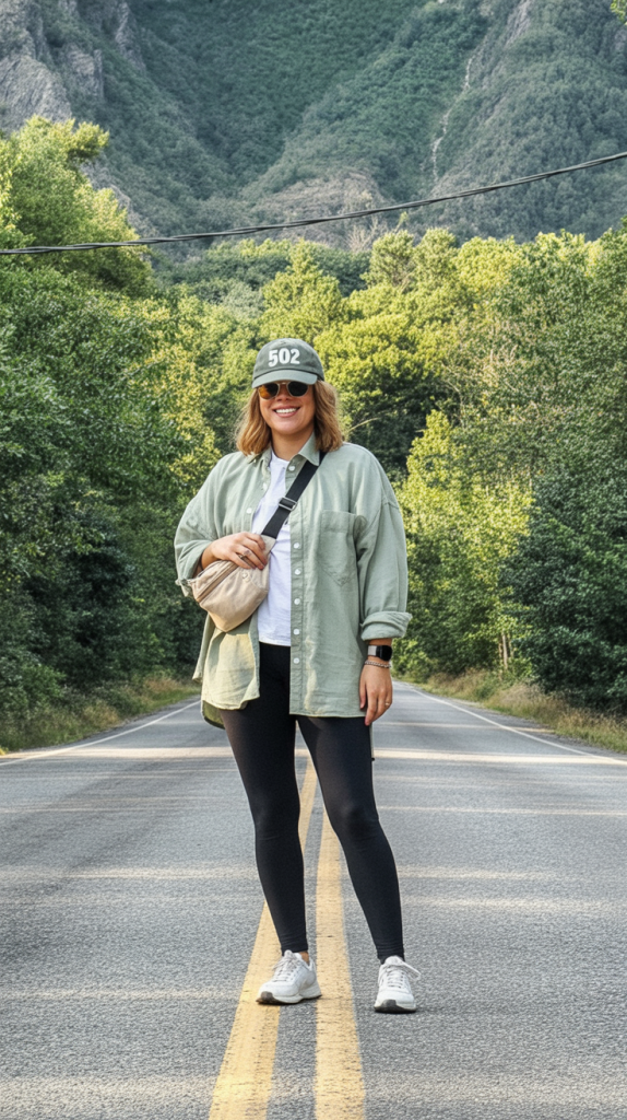 Styling this look is all about harmony: sleek leggings for support, a fitted top for breathability, and a flannel layer tied around the waist for those chilly bursts of cold weather at higher elevation. The vibe leans effortlessly stylish, giving off a “ready for anything” attitude that sets it apart from heavier, bulkier hiking looks.