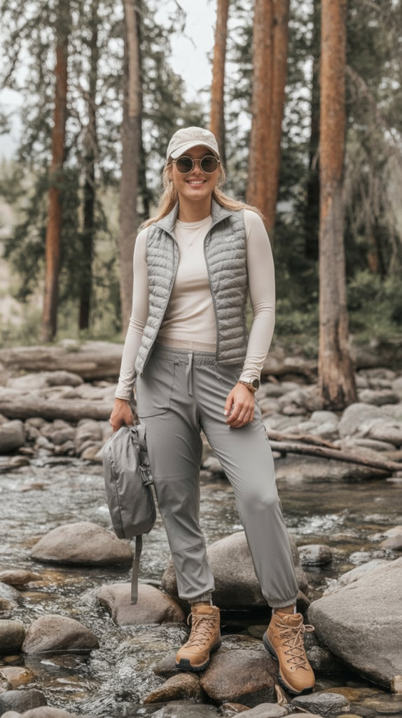 This outfit feels calm and beautifully composed—soft neutrals, gentle layers, and a sense of grounded ease by the water. The quilted vest adds a stylish outdoor touch, while the lightweight top and joggers create a clean, polished look perfect for women’s mountain strolls.