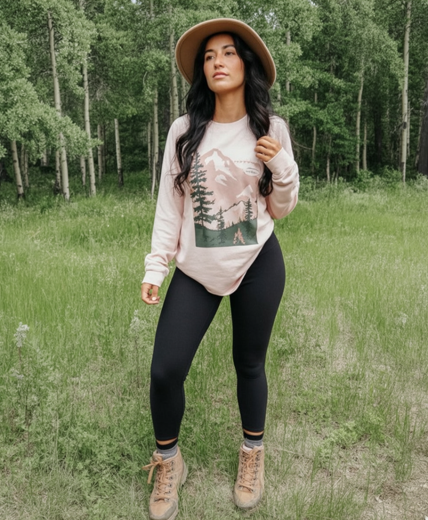 For days that drift between cool breezes and warm sun, this outfit is a winner. The leggings keep movement easy, the boots stay reliable on meadow paths, and the hat adds a chic touch as well as sun protection. The overall vibe is uplifting and soothing, giving you inspo for those calm Women Mountain mornings.