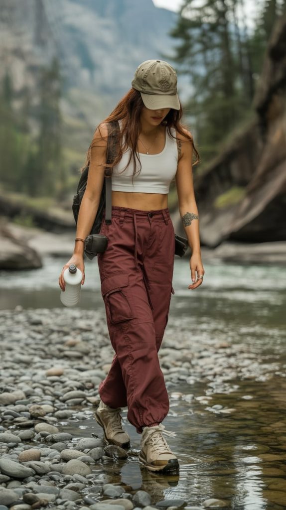 This outfit works beautifully for women with active lifestyles who want breathable fabrics and easy mobility. The cargo joggers are perfect for unpredictable trails, while the cropped top keeps things cool in warm summer or Hawaii-style humidity. What makes this combo special is its blend of freedom and function—ideal inspo for women who love versatile ideas they can wear from riverbeds to forest paths.