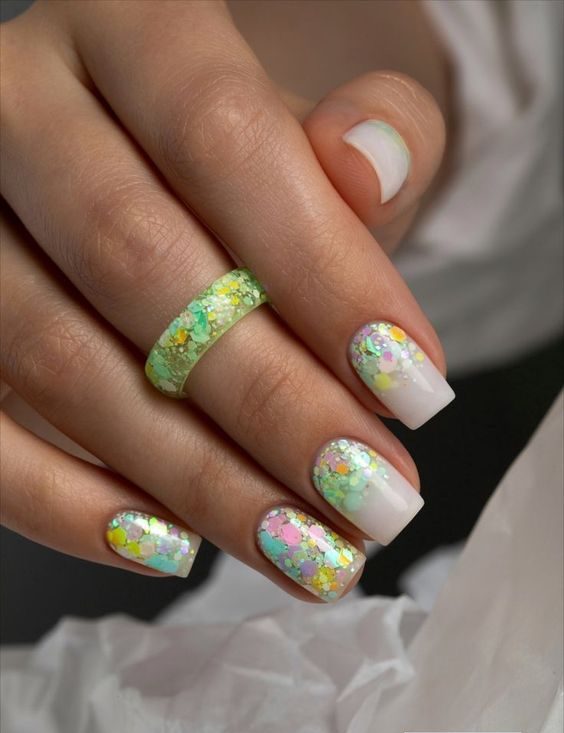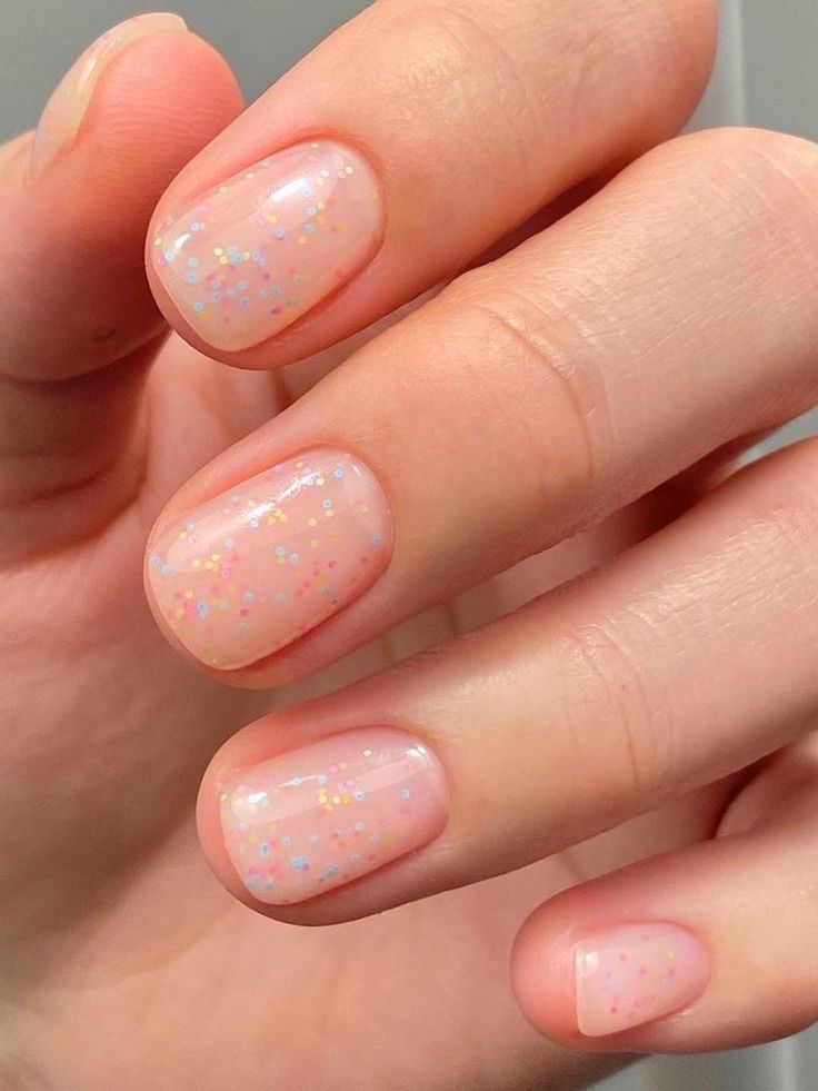 Who says you can’t sparkle during the day? Adding a bit of glitter to your summer nail inspo short designs can transform your nails into a dazzling accessory.
