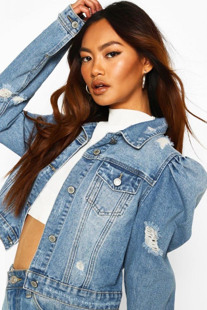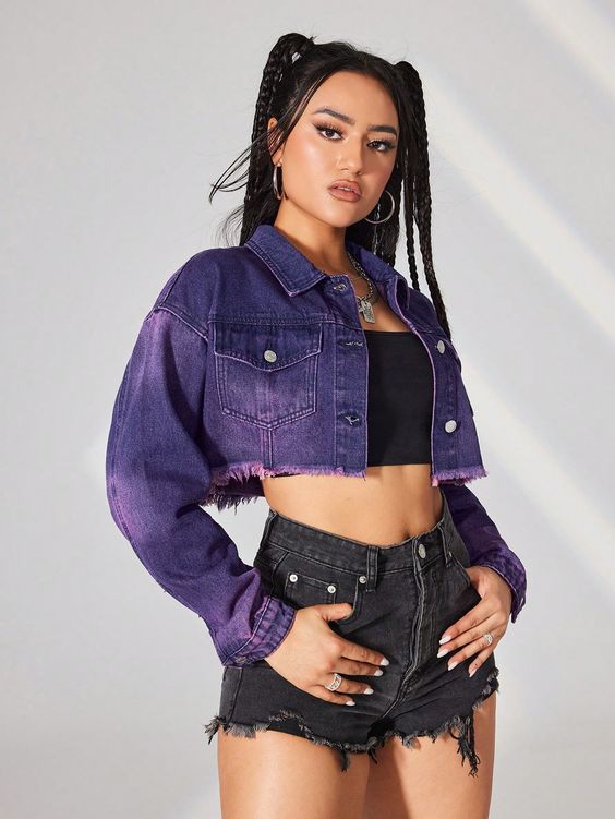 Stepping out of the conventional, a purple denim jacket presents a bold statement. It’s an ideal choice for those looking to add a pop of color to their jeans outfit with jacket. Matched with a pair of black shorts, it’s a standout ensemble for summer nights out or fall music festivals.