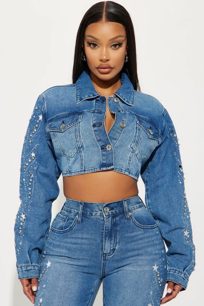 Not shying away from making a statement, this denim jacket adorned with starry embellishments brings fantasy to the everyday. Paired with matching jeans, it’s a jeans outfit with jacket 2024 that’s destined for those who lead the trends rather than follow them. This look bridges the gap between winter’s sparkle and summer’s flair, proving that denim can indeed shine year-round.