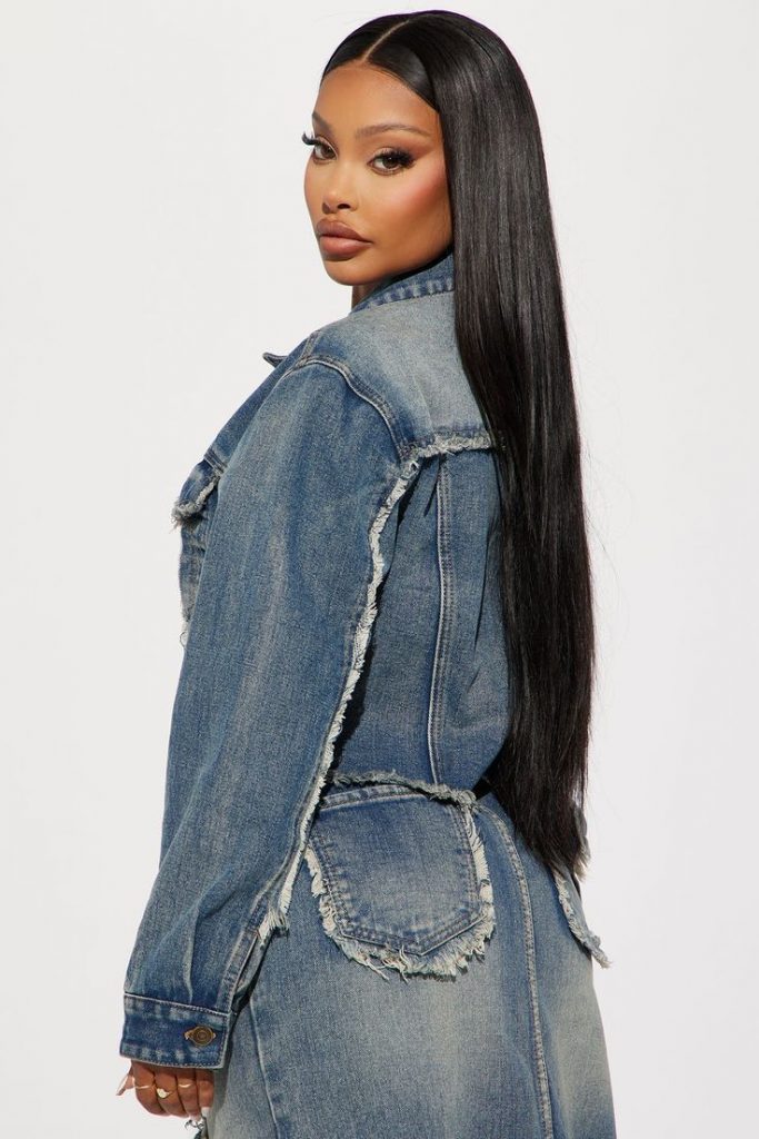 As we explore the dynamic world of jeans outfits with jackets, it’s impossible to ignore the cultural shifts influencing fashion. This image captures the essence of a style that is both forward-looking and deeply rooted in heritage. The model showcases a classic blue denim jacket, slightly oversized for a relaxed fit, paired with a black ensemble that sets the stage for the jacket to shine. What sets this outfit apart is the intricate accessories; the model wears large hoop earrings and has her hair styled in a sleek, long braid, blending in elements of ethnic beauty with a modern jeans outfit with jacket summer look.