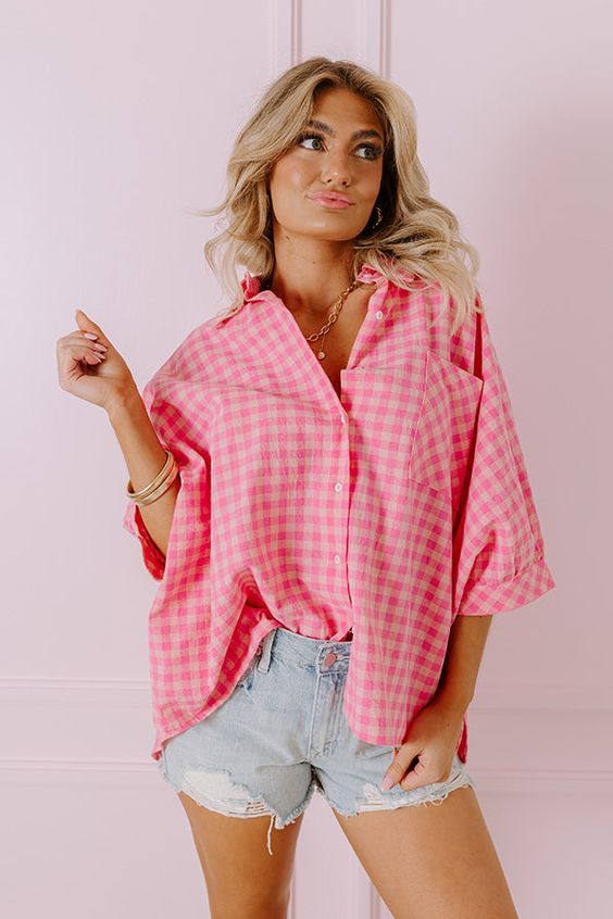 A nod to the carefree days of summer, a loosely worn pink gingham shirt paired with denim cut-offs creates a narrative of playful yet chic. The oversized nature of the shirt lends a relaxed feel, perfect for a weekend brunch or a seaside stroll. Embrace the joy of fabric and pattern as gingham brings a countryside charm to the urban jungle. Mesh this look with a pair of sneakers or sandals, and it’s an epitome of casual sophistication.